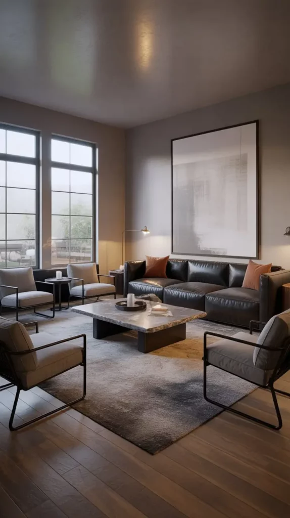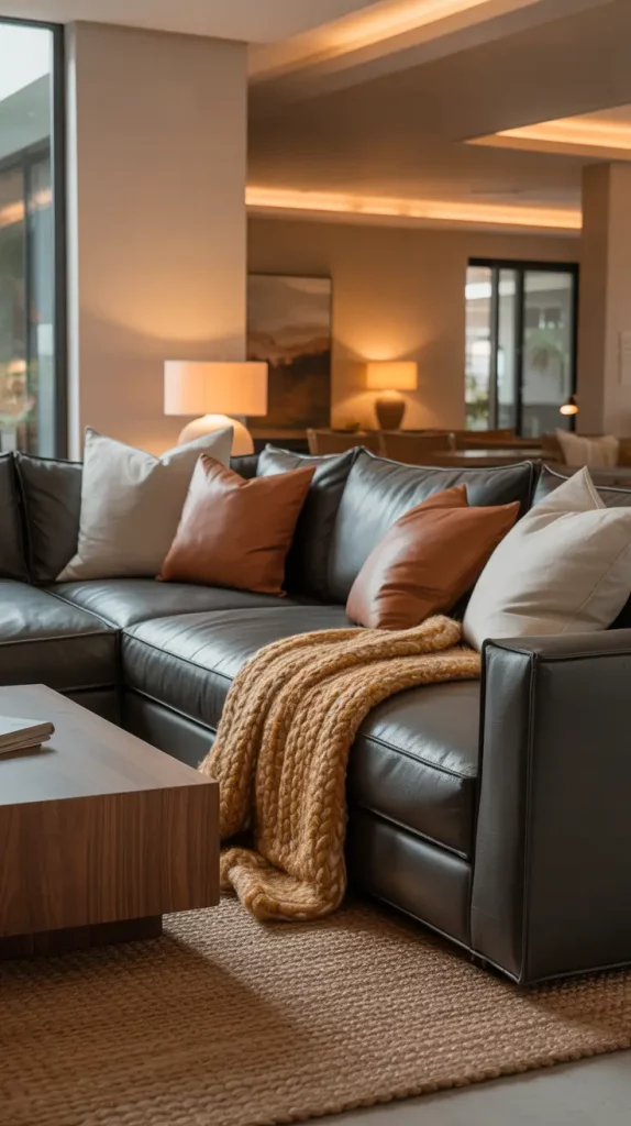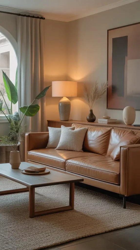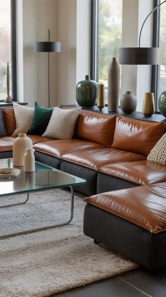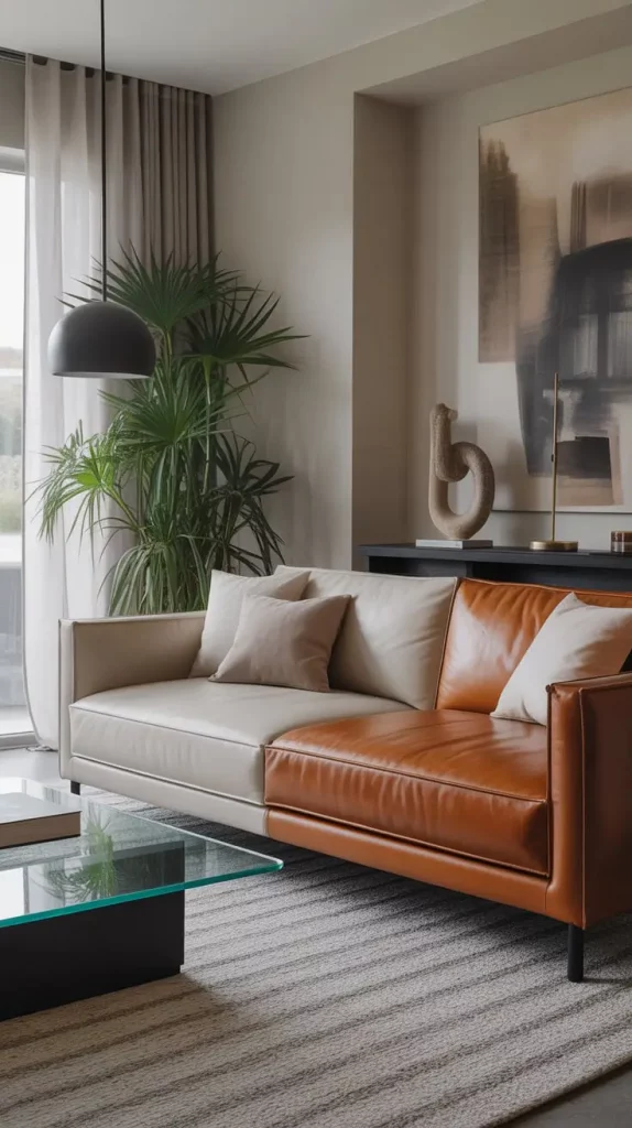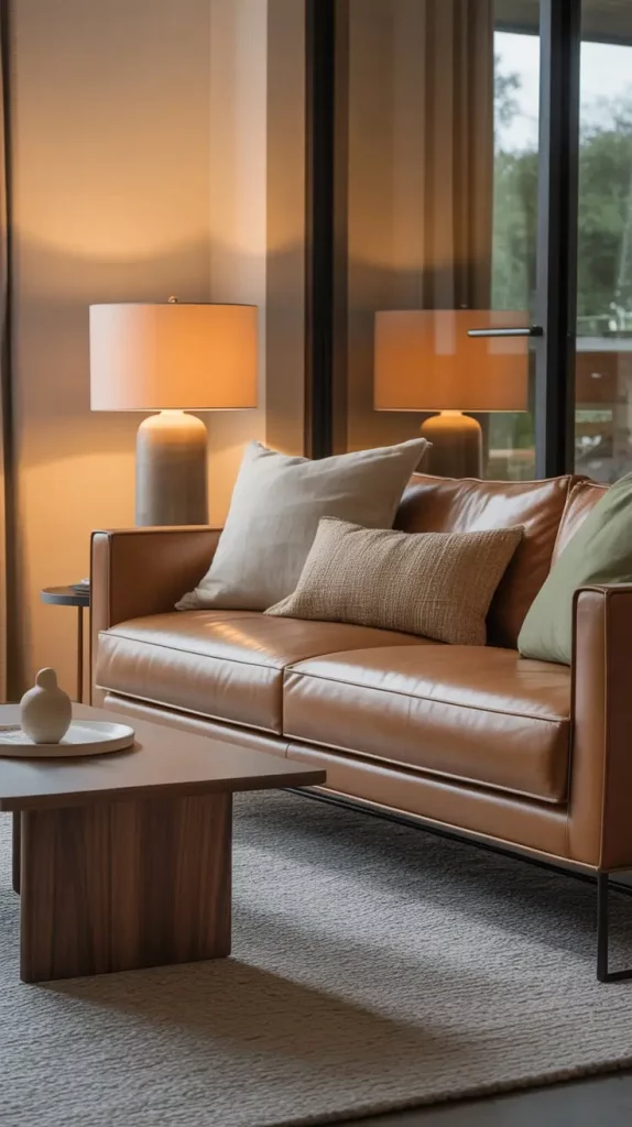 My usual choices are sofas produced using semi-aniline leather, no shine, or butter leather that has been treated to be soft and velvety to the touch. The design is complemented with pieces like wooden coffee table, linen accent chair, or ceramic lamp that adds to the organic quality of the design. I pay attention to balance to ensure that the leather does not dominate the room but instead brings modernity in a nice manner.