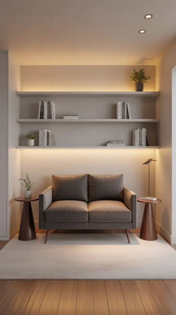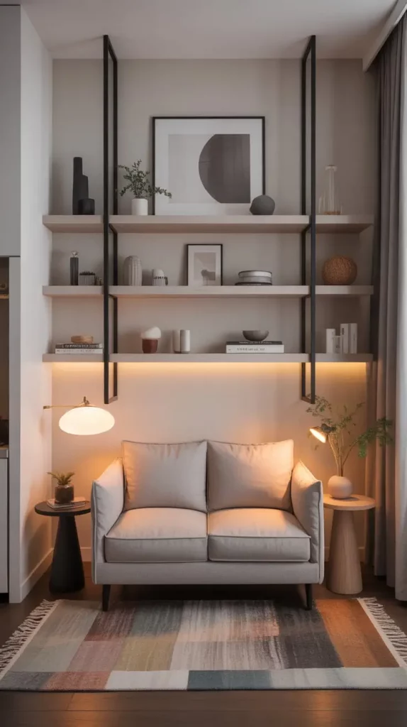 The aesthetic features that I usually favor are loveseats that have narrow legs, inbuilt storage, or streamline body shapes. I also introduce floating shelves, thin side tables, or multi-purpose decor to fill the space to make it better. Even the smallest areas are made functional and elevated by these carefully selected aspects.