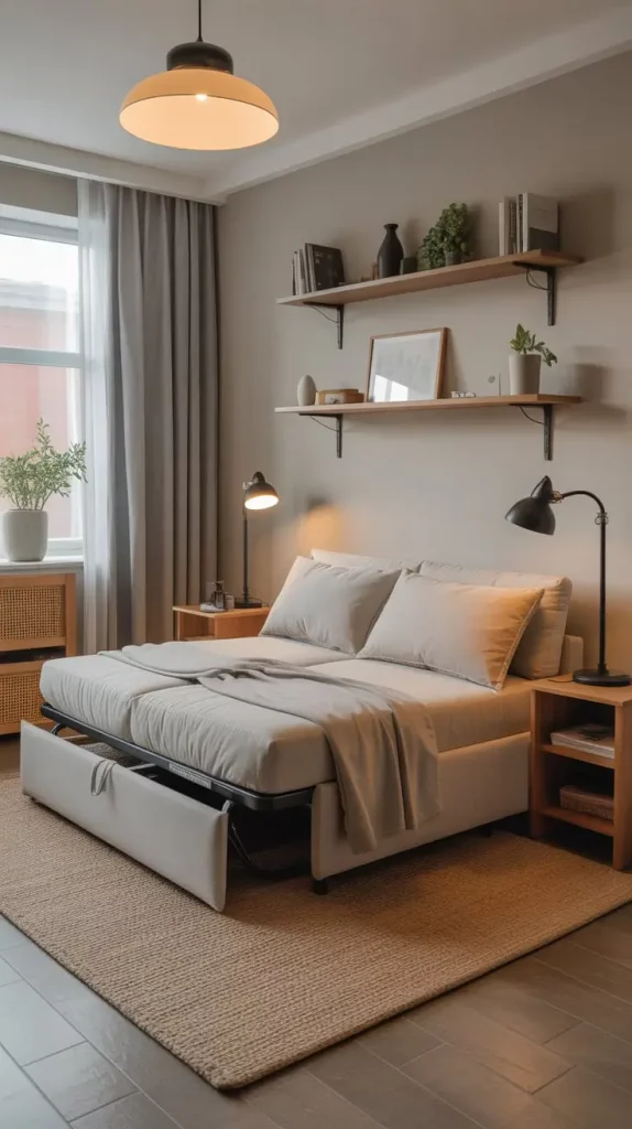 My preference models involve concealed storage, flawless fold-up, and supportive cushions. I include side tables with inbuilt storage, adjustable lamps, or shelf on the walls to make them more functional. These features of the room make it flexible and cozy.