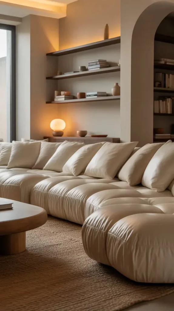 To make the appearance complete, I usually combine deep sofas, oversized throw pillows, soft knitted blankets and well-textured rugs. Rounded edged side tables, wide coffee tables, warm lighting are used to even out the massive size of the sofa. Plush chenille, boucle or textured linen upholstery is inviting, as well as decoratively enriched.