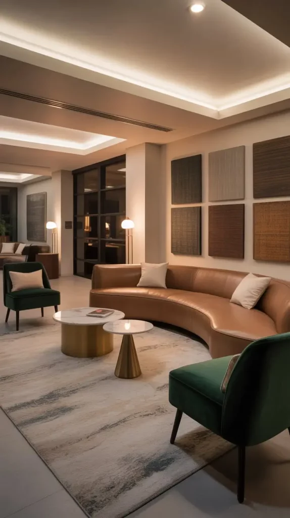 I would also combine sustainably sourced sofas with reclaimed wood tables, ethically-sourced textiles, and handmade decor when creating a sustainable space. The natural textures and neutral tones support the environmentally-friendly design, and a calming atmosphere is provided with the help of soft lighting. Numerous brands have started to have vegan leather options and recycled blends of fiber, which are luxurious in appearance and feel.