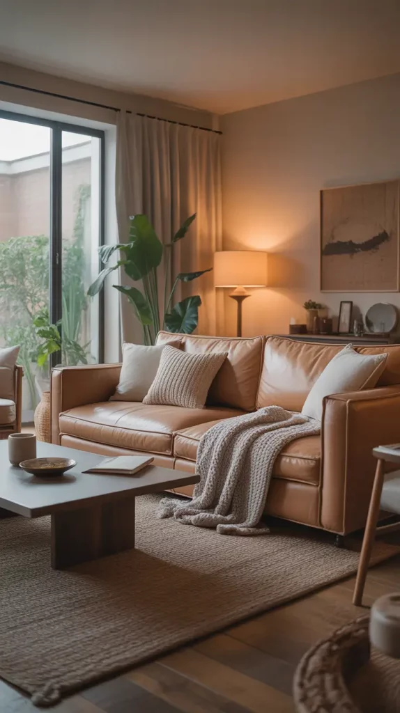 What I would introduce into this is that the inclusion of plants, particularly large leaf types can further enhance the organic aesthetic and make the earth-tone color palette of the sofa feel even closer to nature.