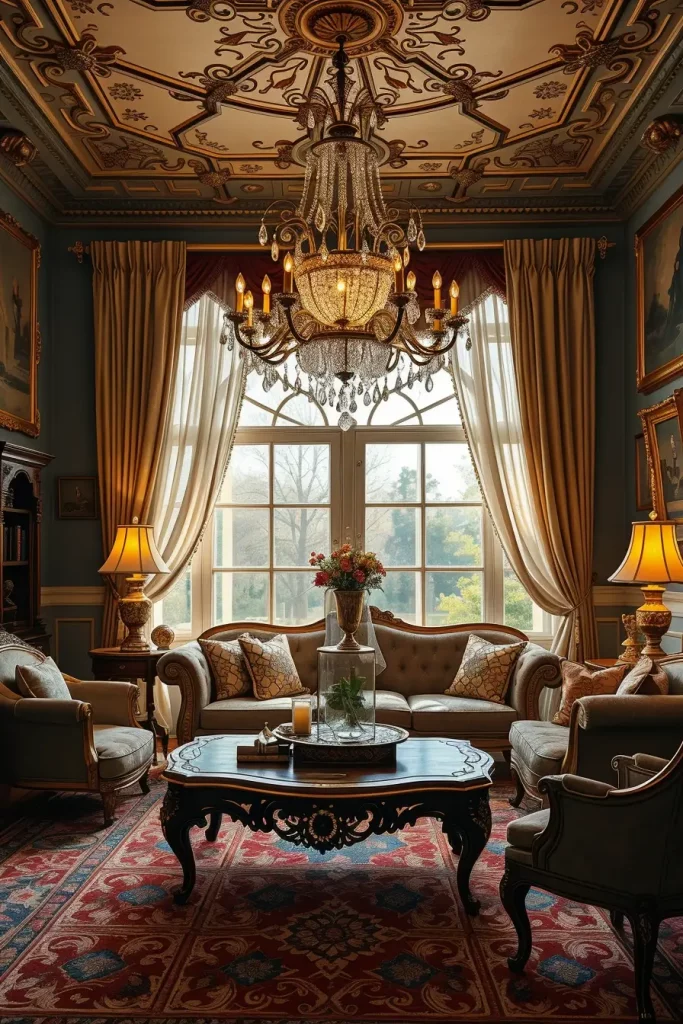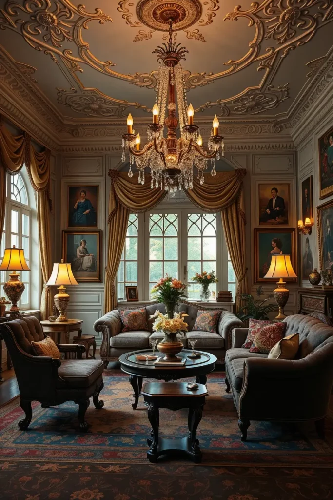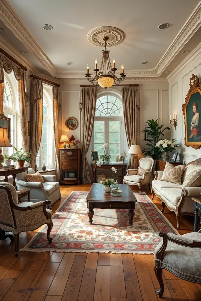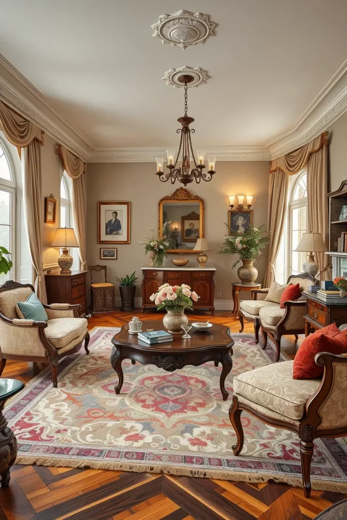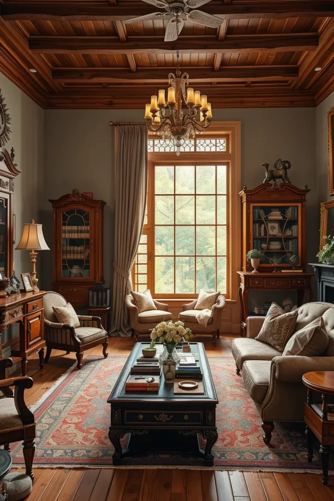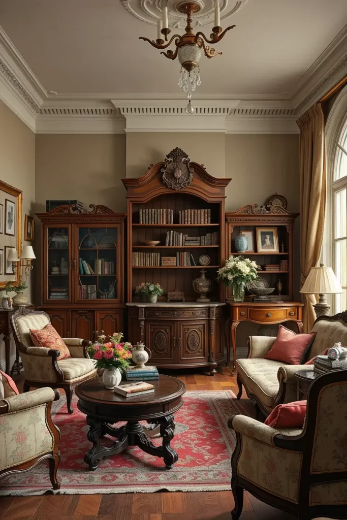 In designing, I give importance to seating which is craftsman. Old sofas with carved wooden legs or rolled arms are both classy and strong. I also prefer to match these with smaller accent chairs or ottomans in matching fabrics. The mixture renders the room friendly and focuses on its classical look.