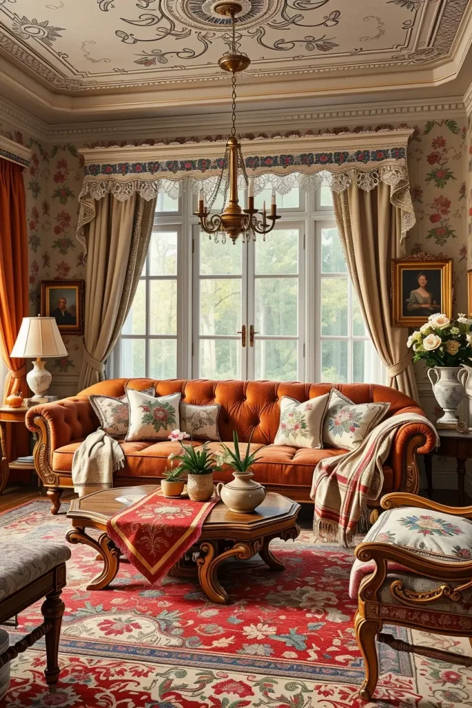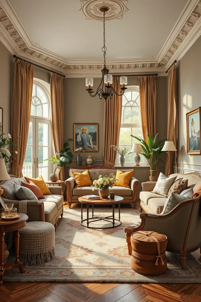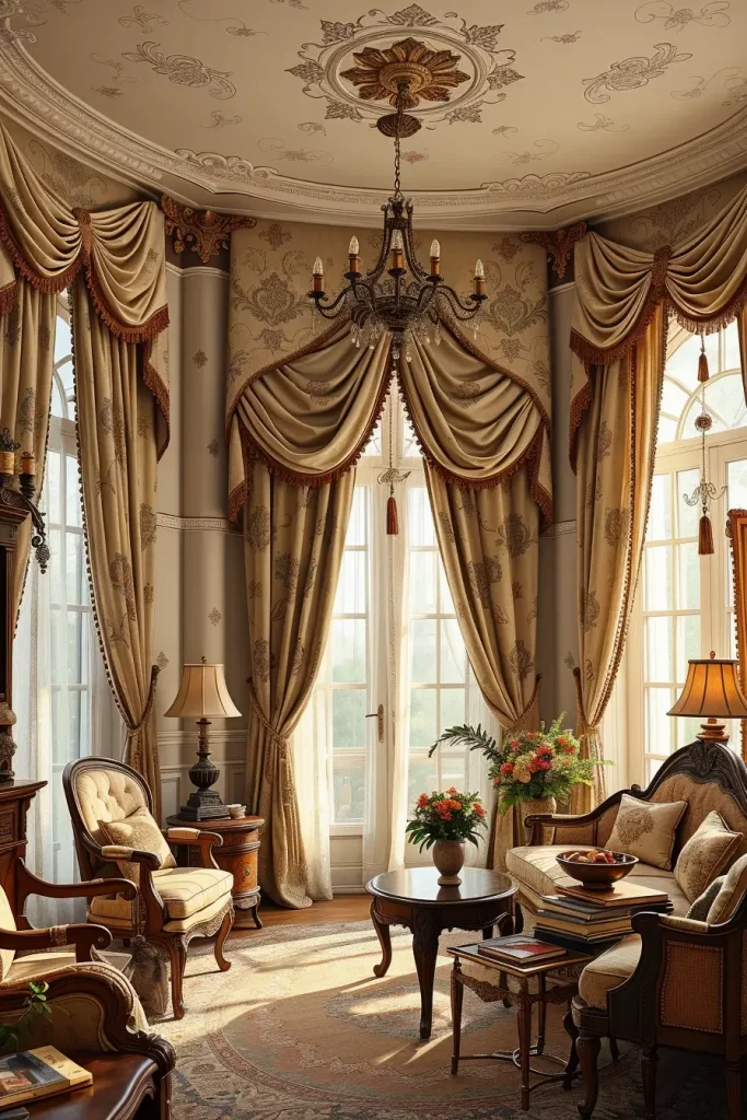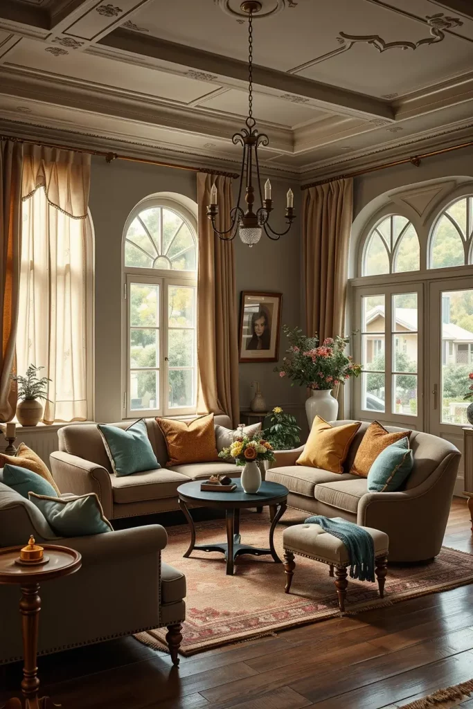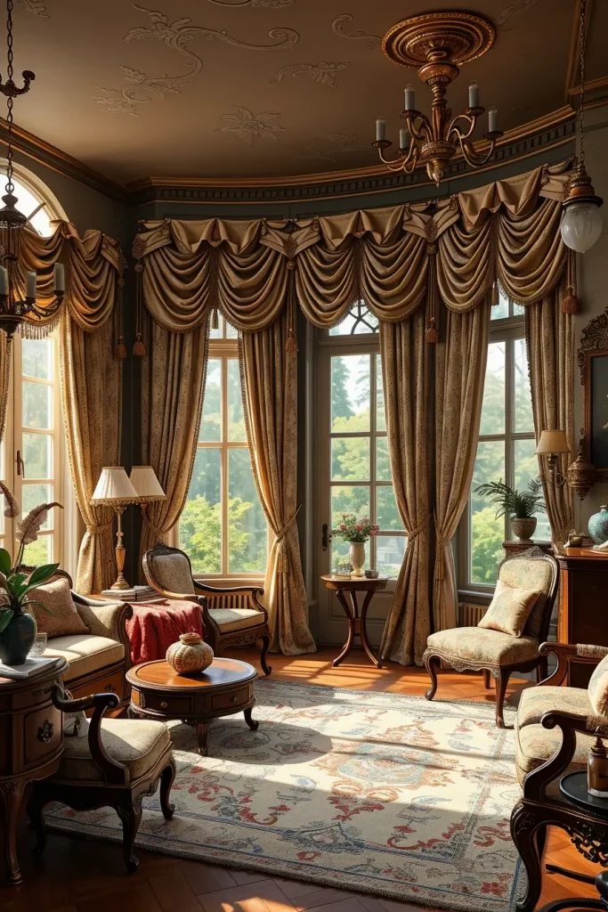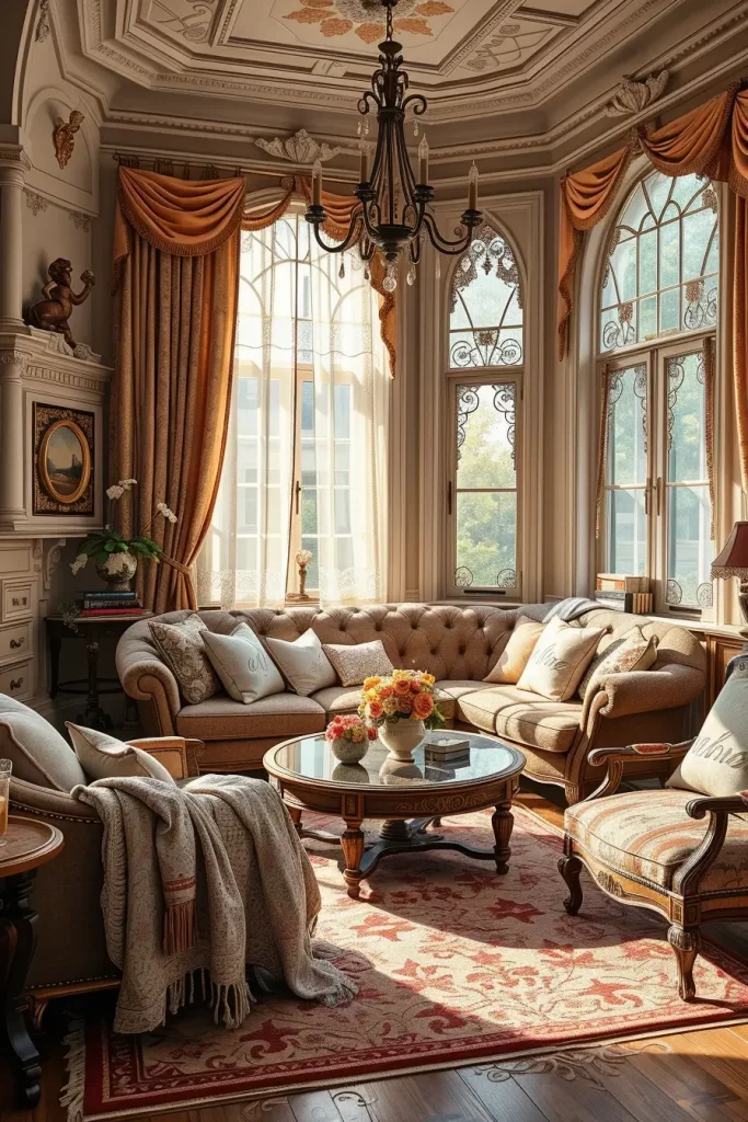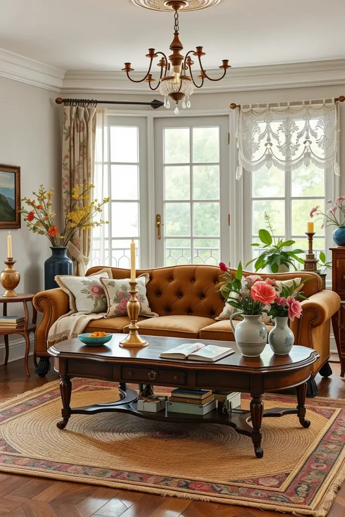 Curtains have a colossal part in old fashioned interiors. In my case, tasseled heavy drapes and fancy curtain rods are the best method of adding old-world charm. They also aid in regulating natural light and cozy atmosphere that is needed in a friendly vintage living room.