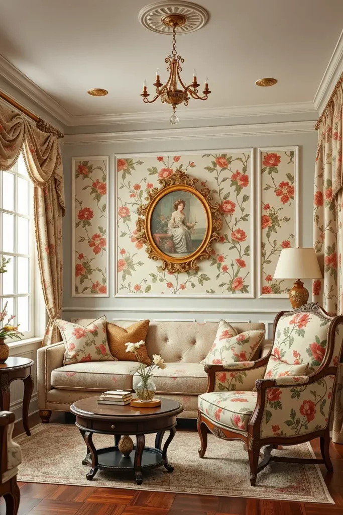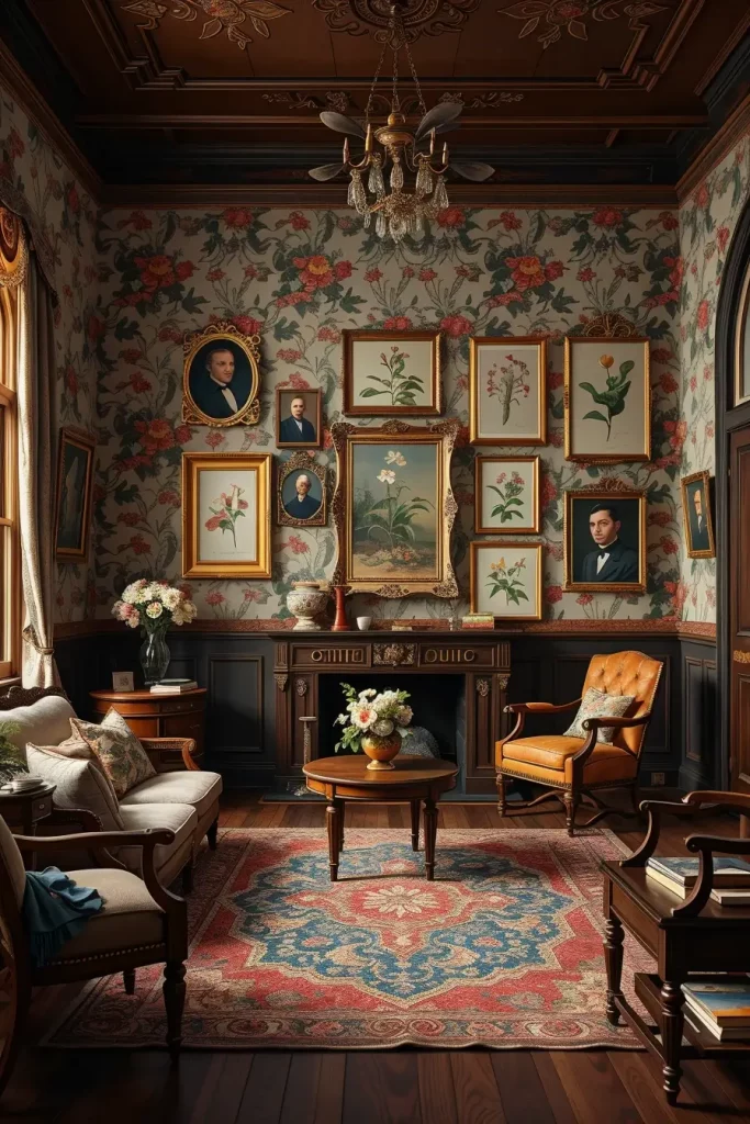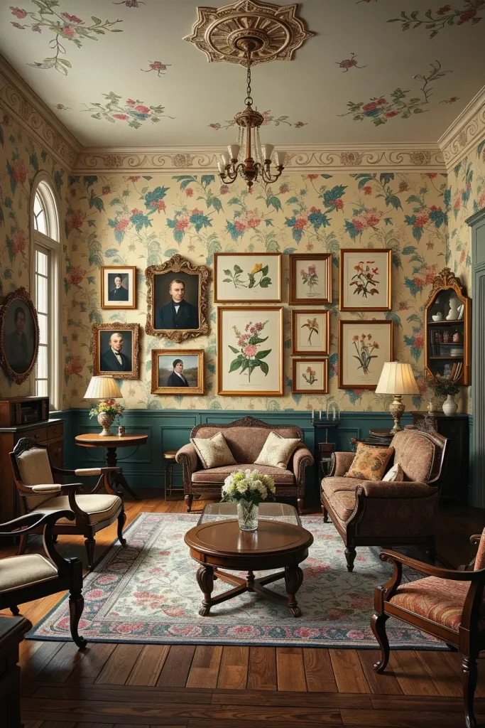 Another distinguishing characteristic of old interiors is the wall treatments. When I create a vintage living room, I always think of the wallpaper patterns such as florals, damasks or geometric prints that remind me of mid-century or Victorian styles. They give a background that immediately gives the feel of the room.