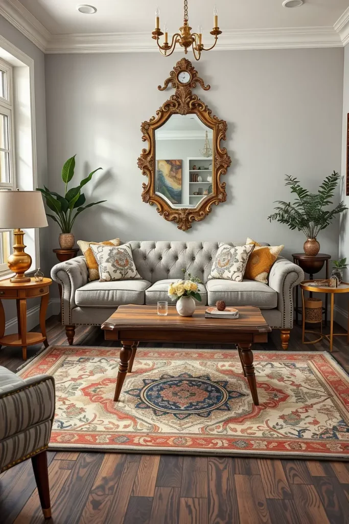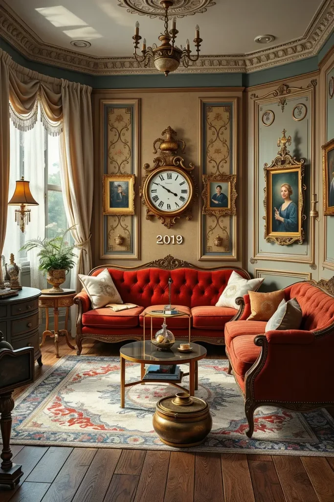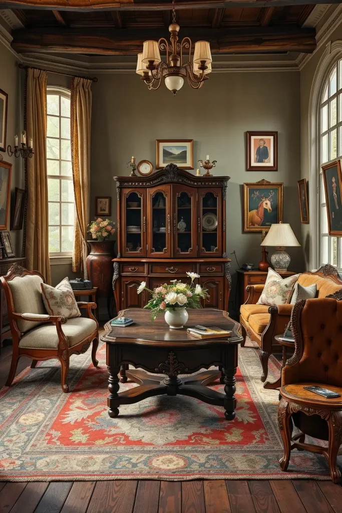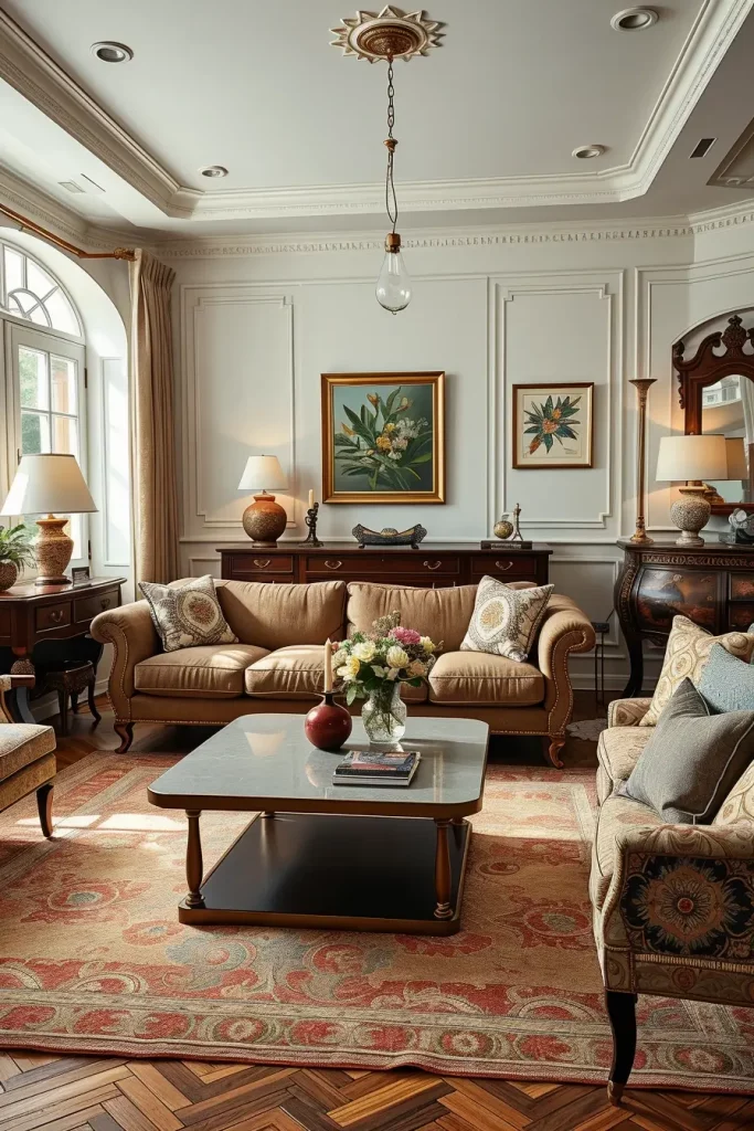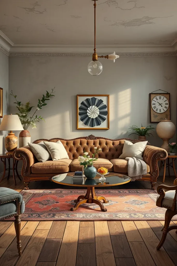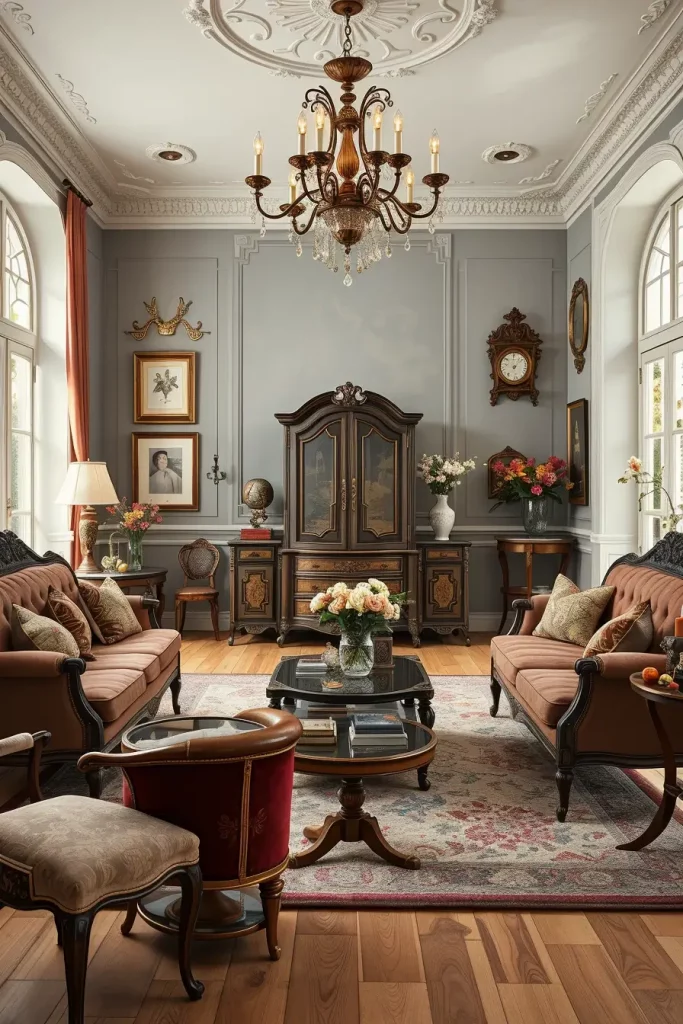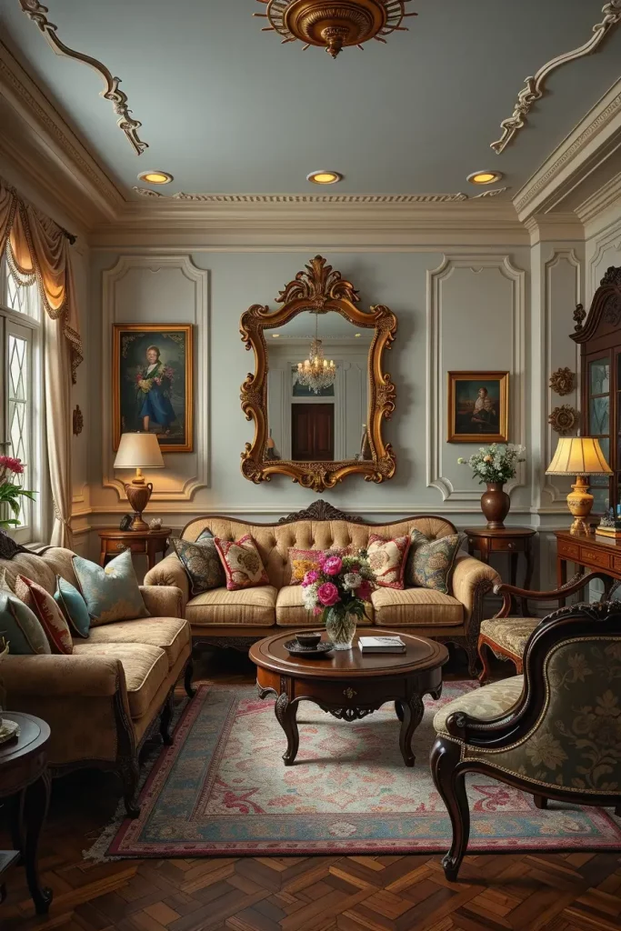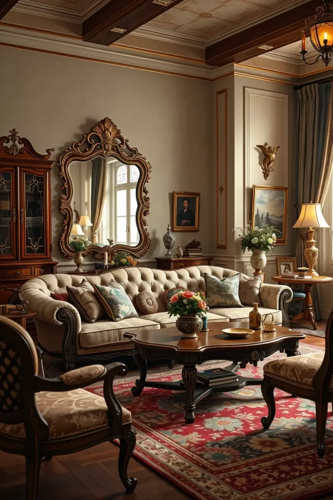 During my designs, I tend to emphasize fancy mirrors, carved coffee tables, tufted sofas, and fabrics that are very textured such as velvet or brocade. These facts make the room alive. Even minor details, like brass doorknobs or handwoven carpets, support the vintage theme without being overpowering the room.