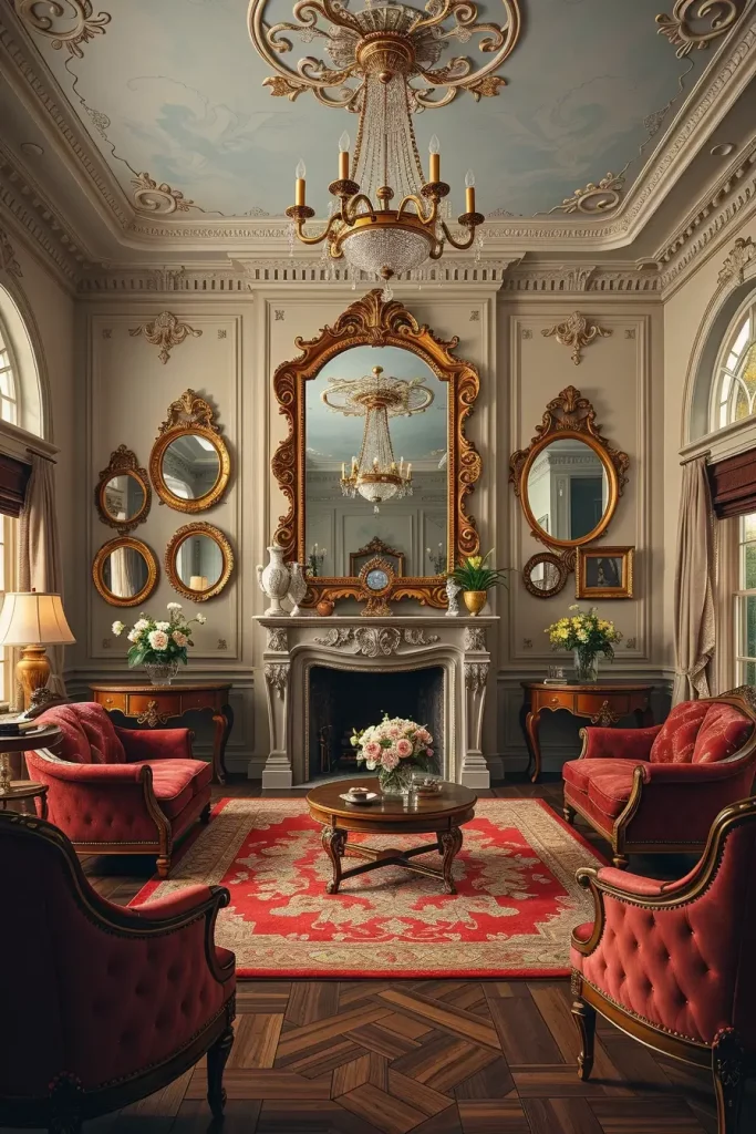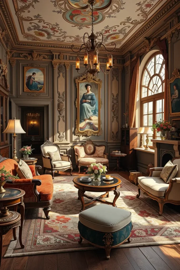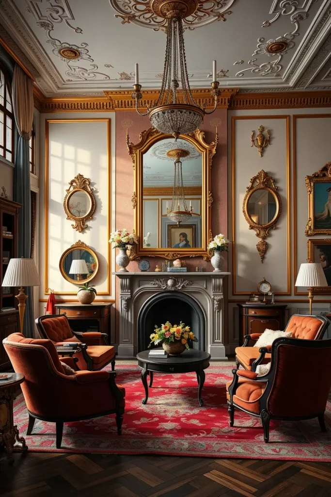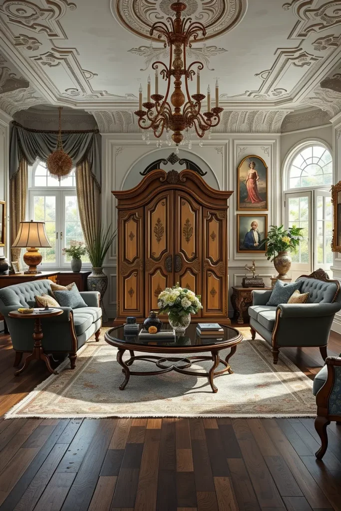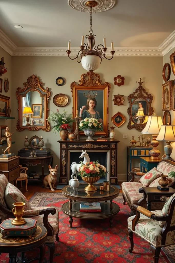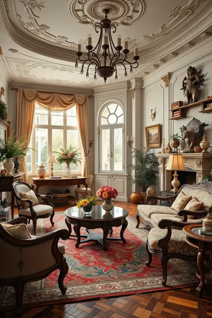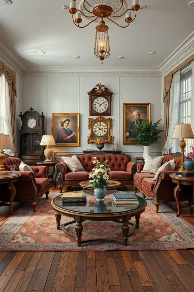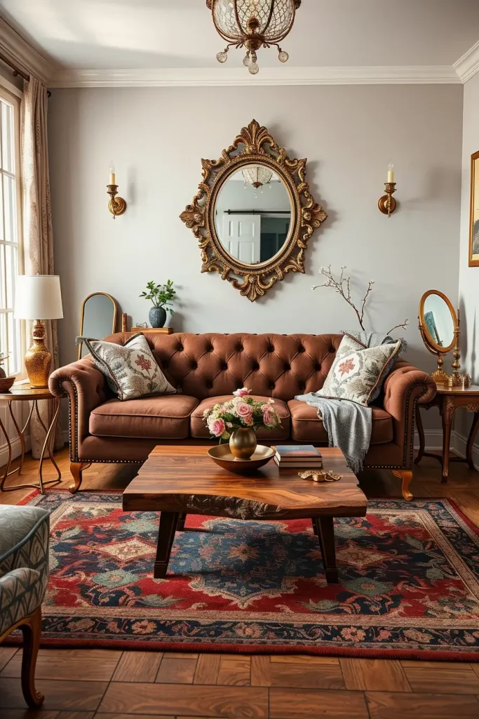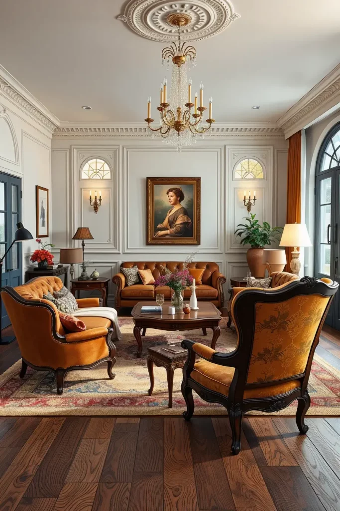 During my designs, I tend to emphasize fancy mirrors, carved coffee tables, tufted sofas, and fabrics that are very textured such as velvet or brocade. These facts make the room alive. Even minor details, like brass doorknobs or handwoven carpets, support the vintage theme without being overpowering the room.