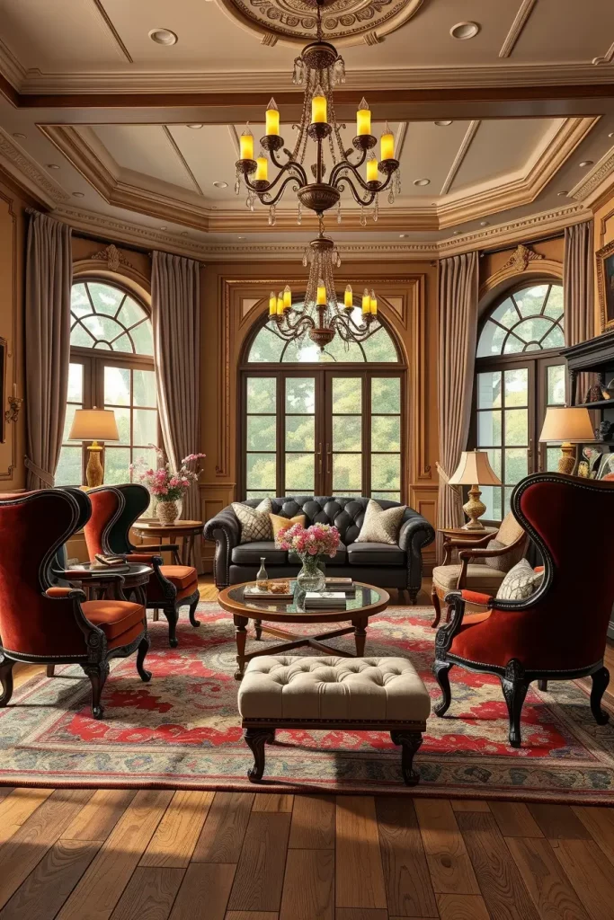 In open layouts, furniture choice is essential. A set of wingback chairs is paired with a velvet sofa with carved wooden feet, which is used to anchor the seating area. In the same space, a farmhouse-style wooden table with antique chairs is used to provide unity in the case of dining areas. The inclusion of oversized chandeliers or pendant lights with old finishes of brass gives it a point of focus that completes the whole concept.