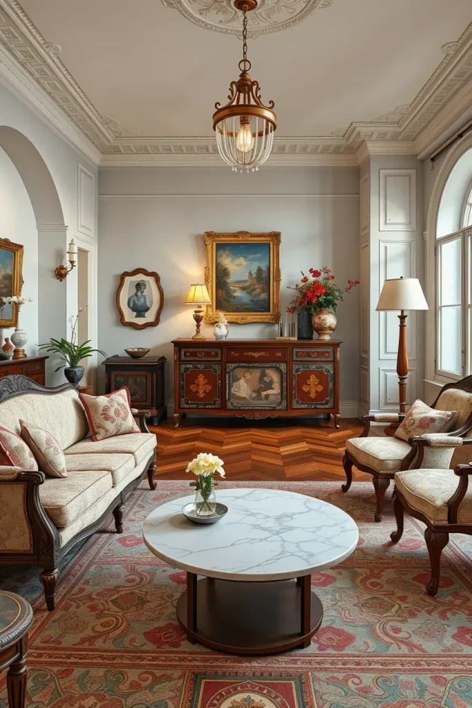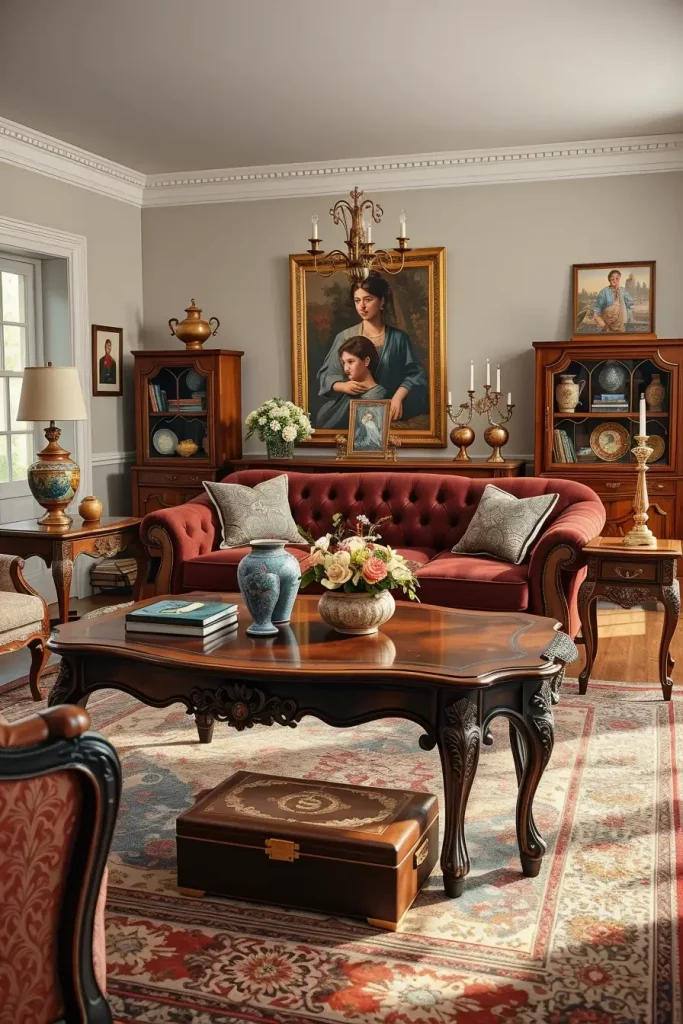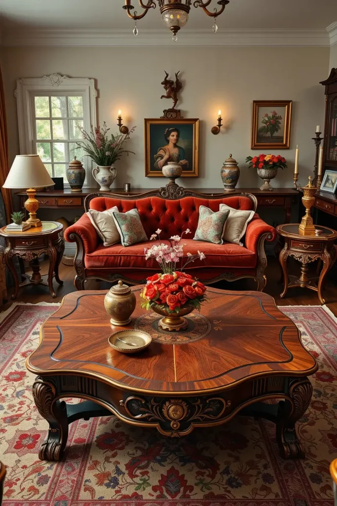 I think the existence of side tables and coffee tables that have a history is one of the most characteristic elements of a vintage living room design. These works tend to have craftsmanship information that you just do not get in mass-produced furniture in the present day. The wooden legs are carved, marble tops are added to such tables and they add beauty and richness to the room. I consider them not only beautiful but also very practical as they can be used as the center of meetings and decorations.