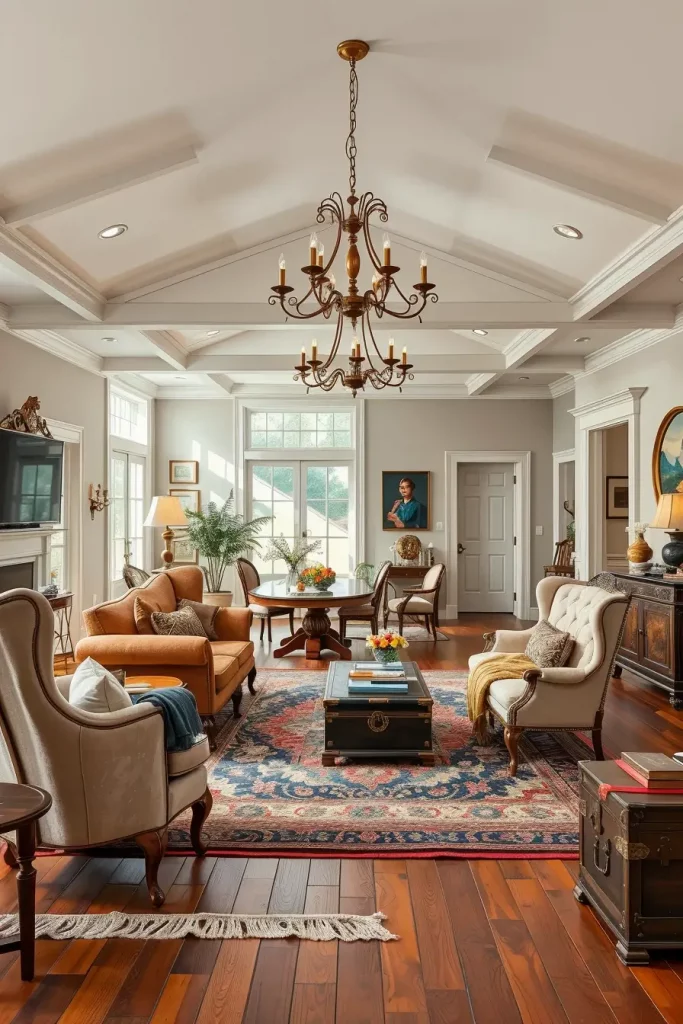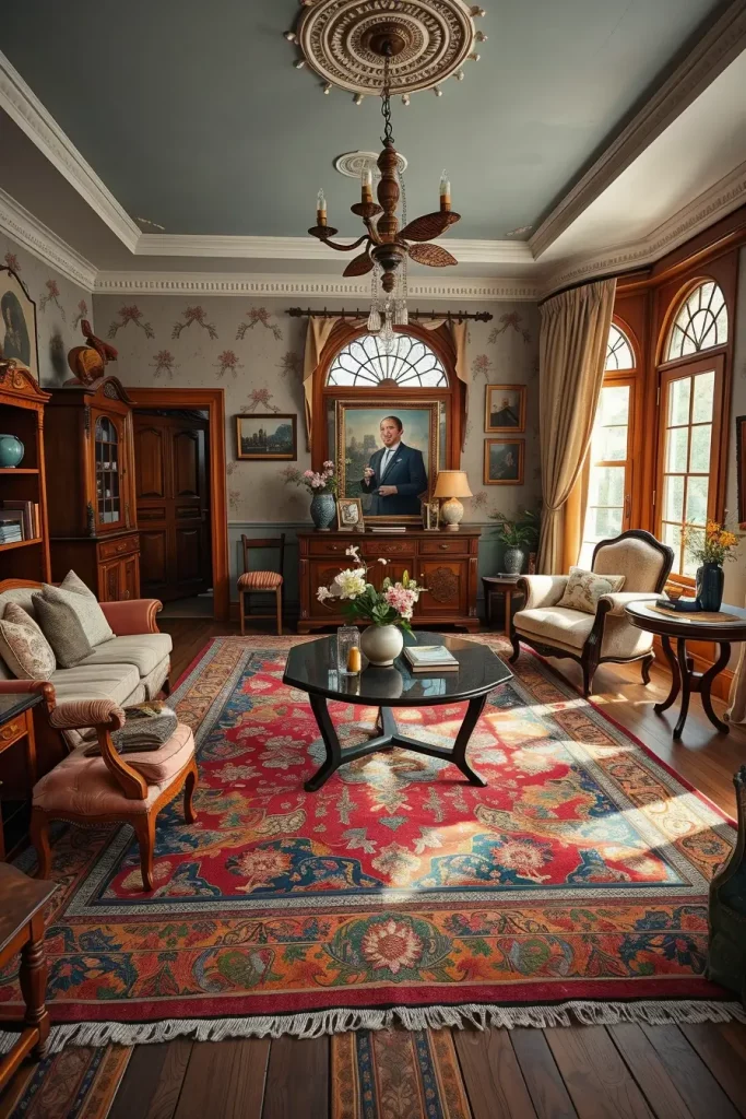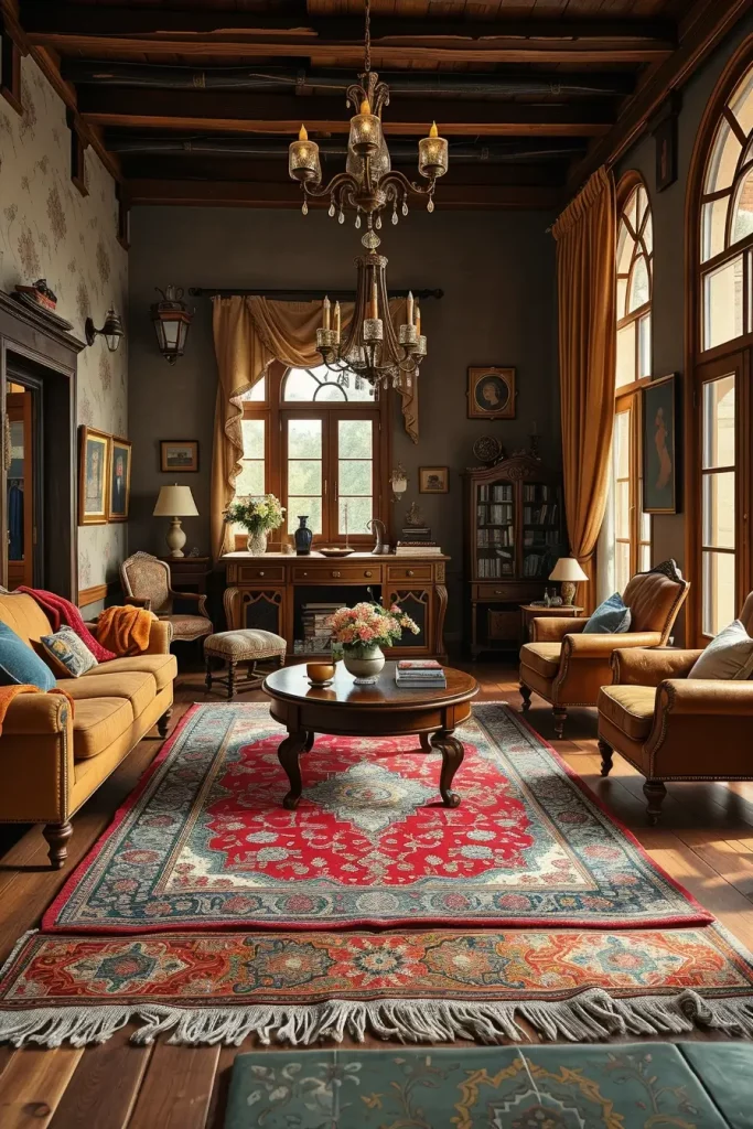 Open-concept living spaces present a special chance to combine the old-fashioned style with the modern design. To create a visual demarcation of the spaces, I prefer to have area rugs so that the old-fashioned flavor does not get lost in the expansive openness. Patterned large patterned rugs, particularly Persian or Oriental, provide natural boundaries to sitting space and add coziness and tradition to the interior.