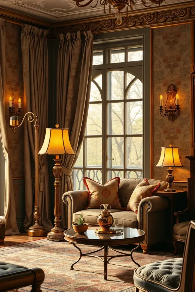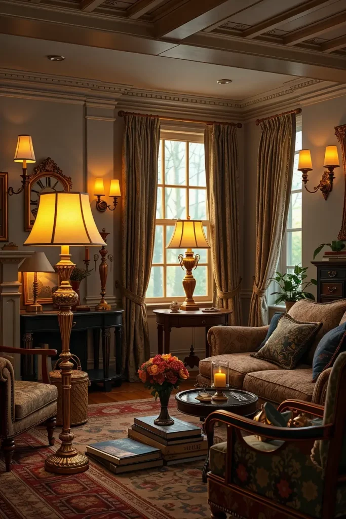 In my case, chandeliers and lamps are not only a useful tool, but also a decorative focus of a vintage living room design. An example of this is a crystal chandelier which instantly gives a sense of grandeur, or an old fashioned table lamp with a patterned shade that gives a sense of comfort and closeness. These accents raise the room to a whole new level, not only stylish but also to be remembered.