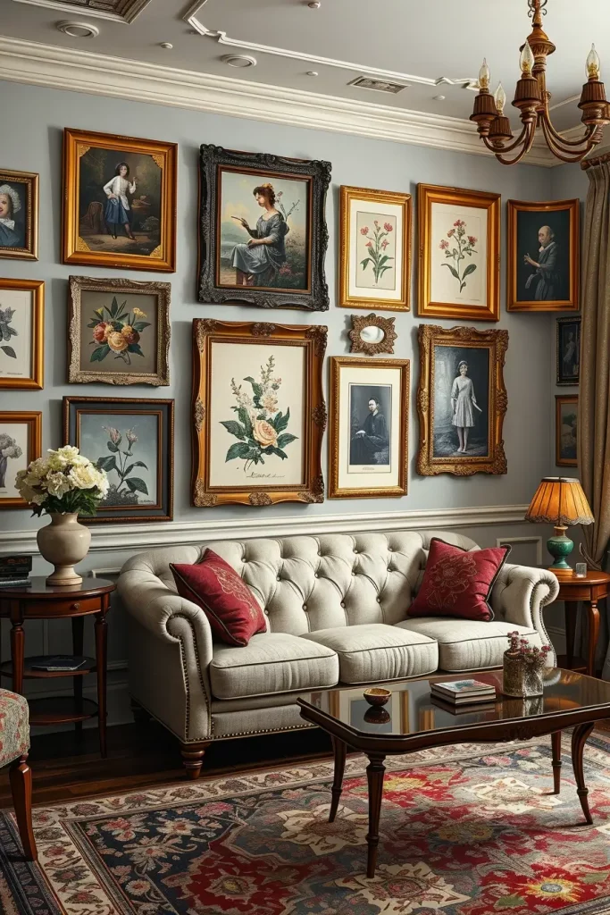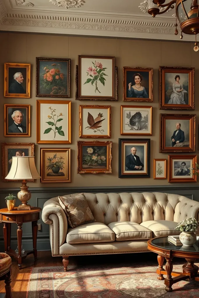 Wall art is not left behind here. The room has personality in antique portraits, botanical prints and fancy frames. I frequently suggest building a gallery wall where a mix of frames and sizes is used but with a uniform vintage palette.