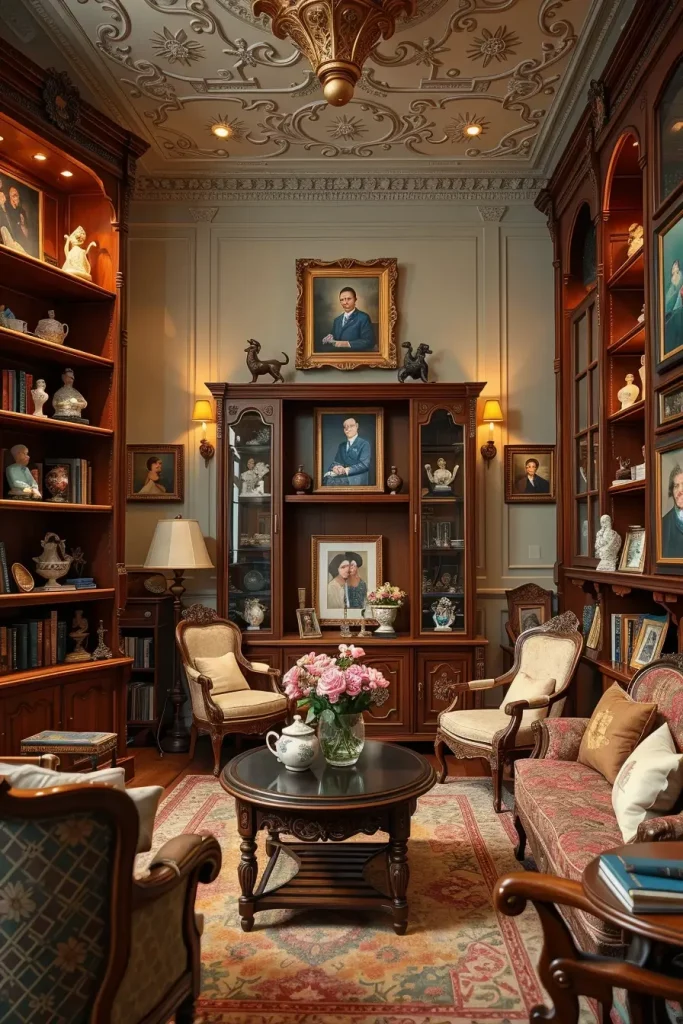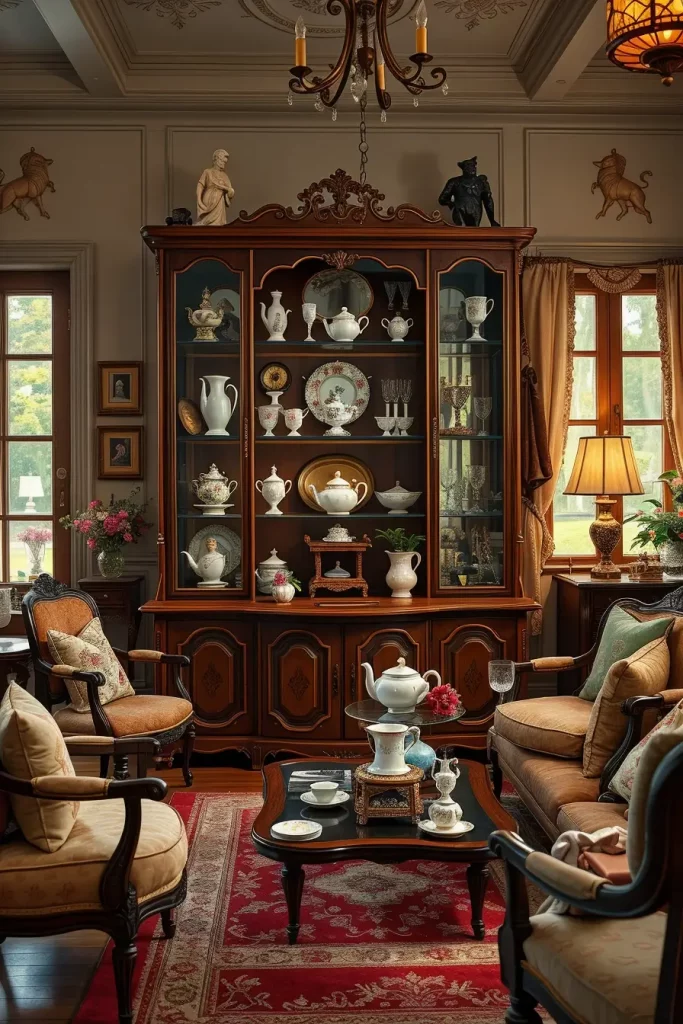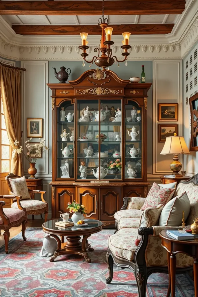 I like glassware and porcelain as some of my favorite decorative objects when dealing with a vintage living room design. The room has display cabinets of porcelain figurines, teacups and glassware that make it look delicate and sophisticated. Their usability is in the sense that they serve as both decor and family heirloom, and thus they are the items that help us relate to the past.