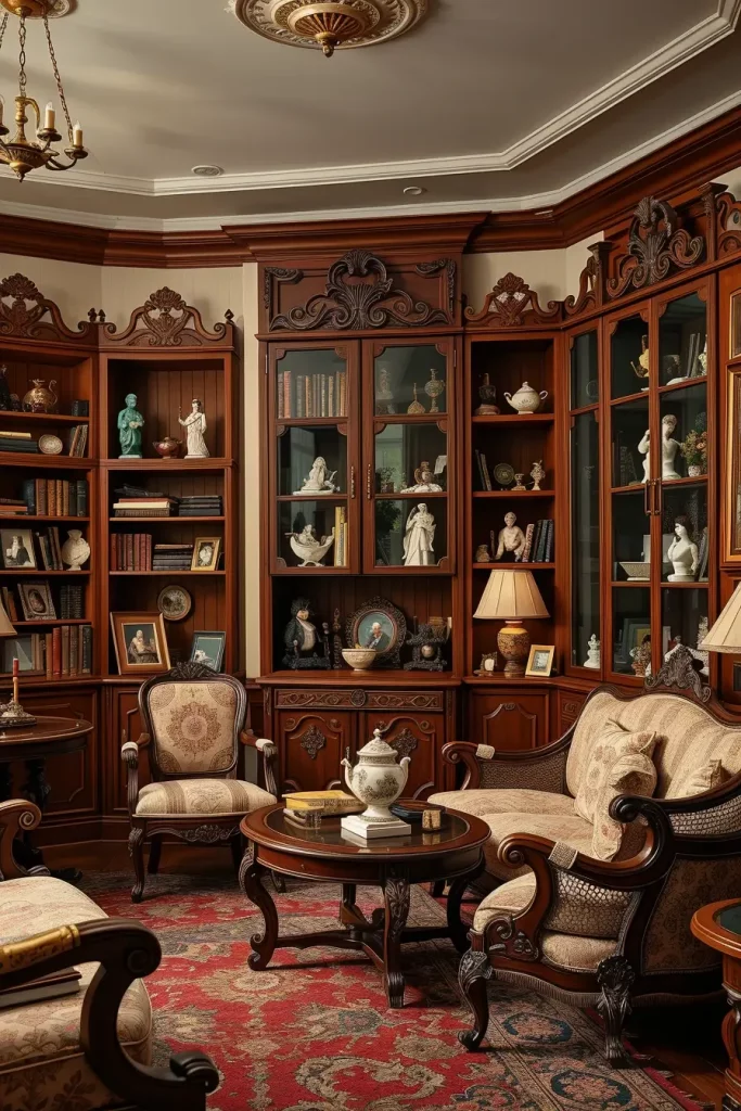 Bookshelves are useful and elegant in old houses. I usually recommend wooden shelves with carved ornamentation or glass-front cabinets to store books and collectibles. This mix is both storage and highlighting the elegance of the old fashioned living room concepts.