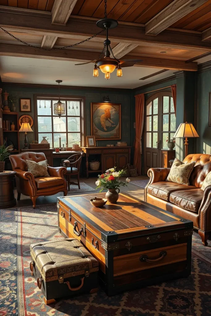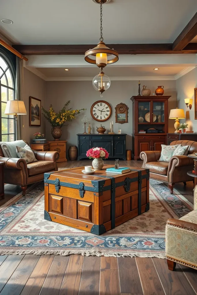 Vintage trunks and chests are not merely storage but also the statement in a vintage living room. I like them as coffee tables, side tables or even additional seating with a cushion on top. They are the most practical, particularly to people who desire functional furniture that has personality.