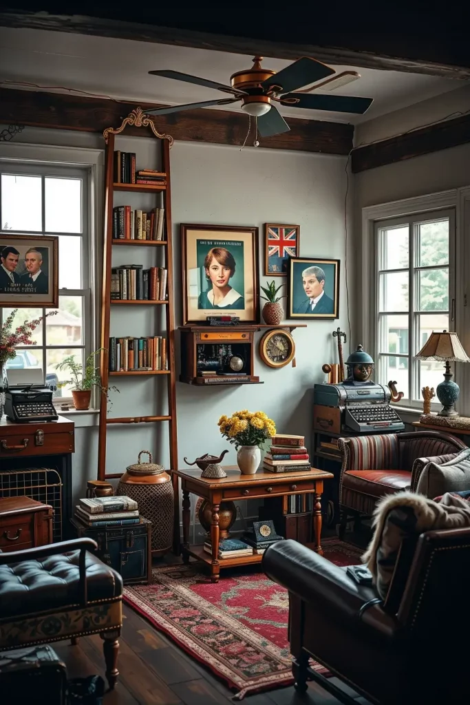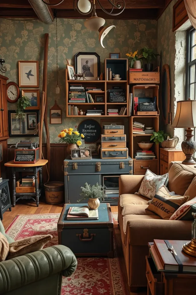 One of the creative methods of making a vintage living room design unique is through repurposing old items. I usually steal old suitcases, sewing machines or wooden crates and turn them into useful decorations. This does not only minimize waste but also makes the room look unique.