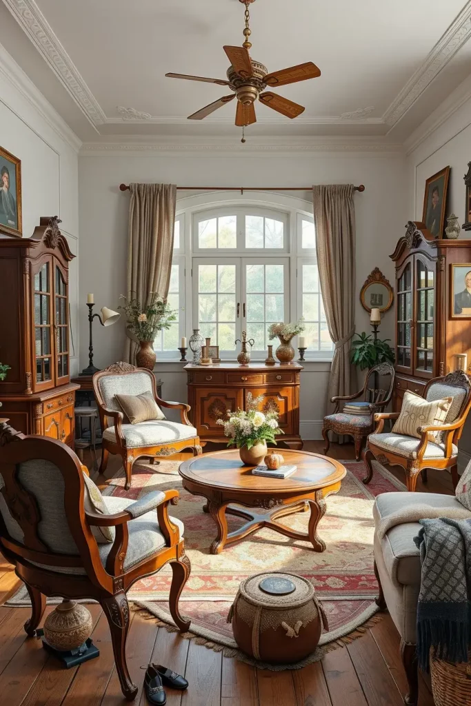 In the case of a small living room, I discover that vintage design does well by filling the room with character-filled furniture without crowding the room. The antique wood is contrasted with a neutral wall color that gives a relaxing but aesthetically pleasing effect. Embroidered cushions or woven throws that add soft, patterned textiles can be used to add layers to the appearance without overweighting the space.