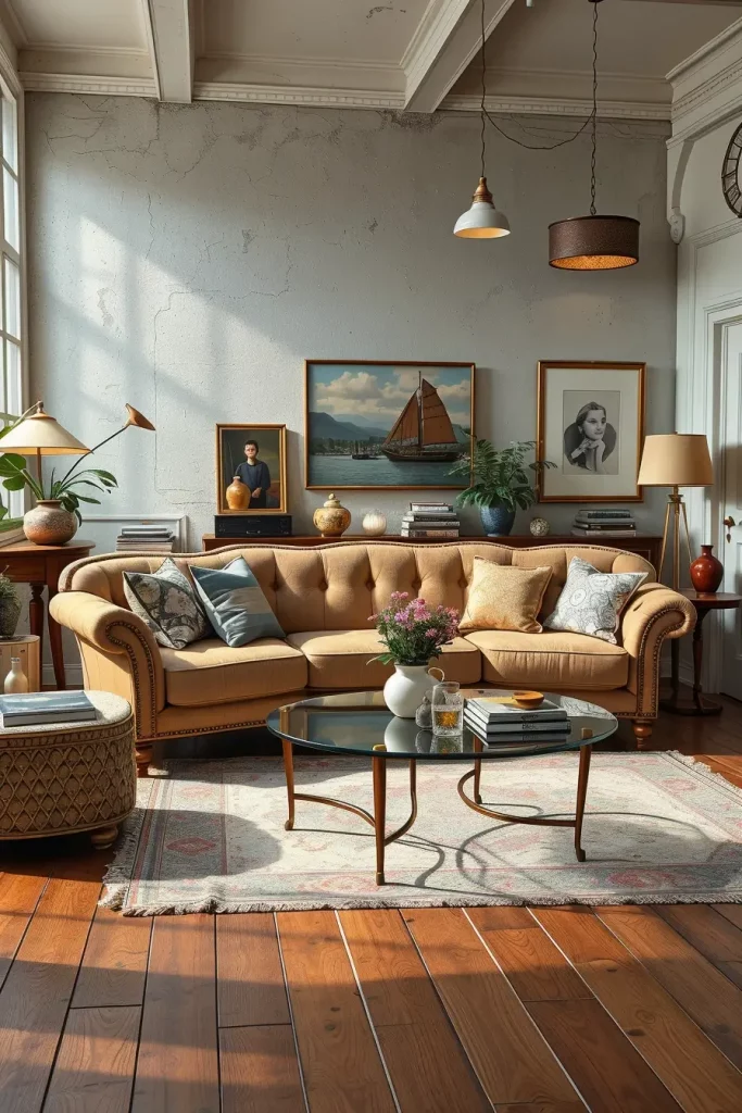 Vintage appeal is achieved in my design experience with such pieces as distressed wooden furniture, velvet upholstery, gilded frames, and patterned wallpaper. Everything has a story to tell, and the living room has a soulful feel. Adding certain accessories such as brass lamps, lace curtains, or antique clocks supports the aesthetic, turning the room into not only beautiful but also very personal.