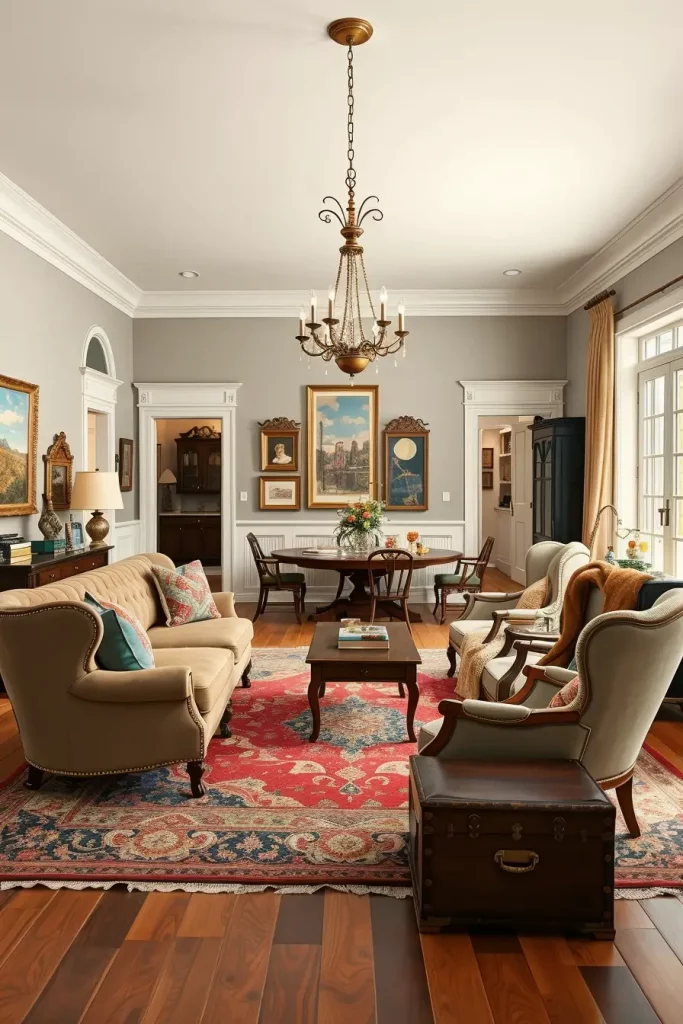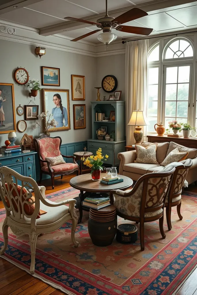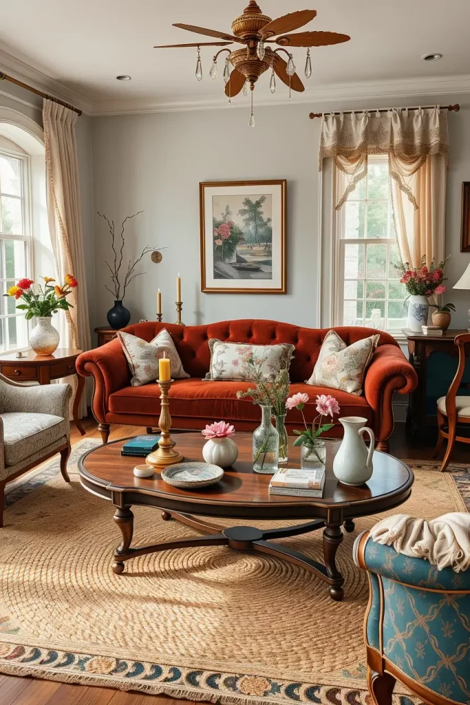 The appropriate accessories are needed here. As an illustration, the authenticity is provided by ceramic vases with seasonal flowers, antique trays on coffee tables, and decorative clocks. Replacing the heavy velvet drapes with the sheer linen during the summer makes the room feel light but still rooted in the vintage style. Even the rugs can change with the seasons- darker during cooler weather and lighter woven during warmer weather.