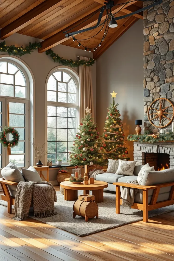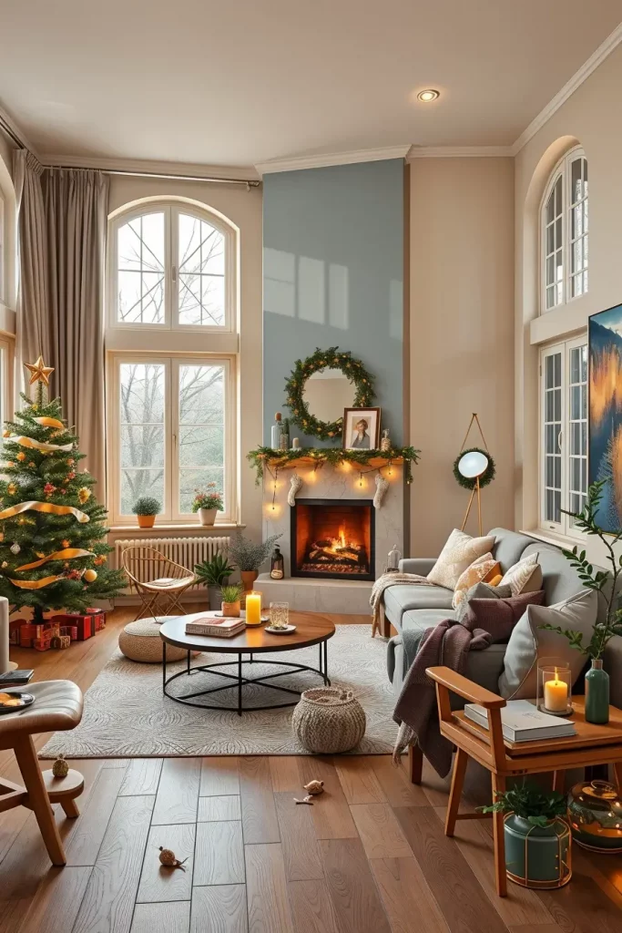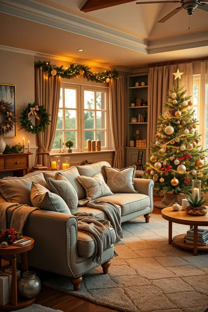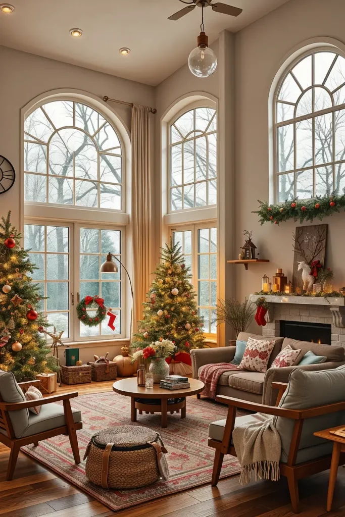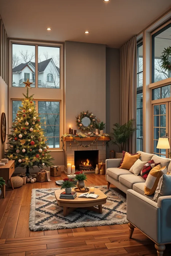 In the case of furniture and design, I prefer it when DIY light jars are put on the side tables, mantels, or shelves. Placing warm lights as drapes on wooden frames or weaving in home-made garlands would help to make the place more intimate. A reclining chair and blanket added near the chair make the place a holiday reading nook.