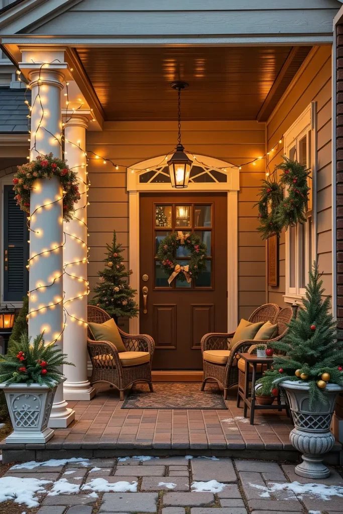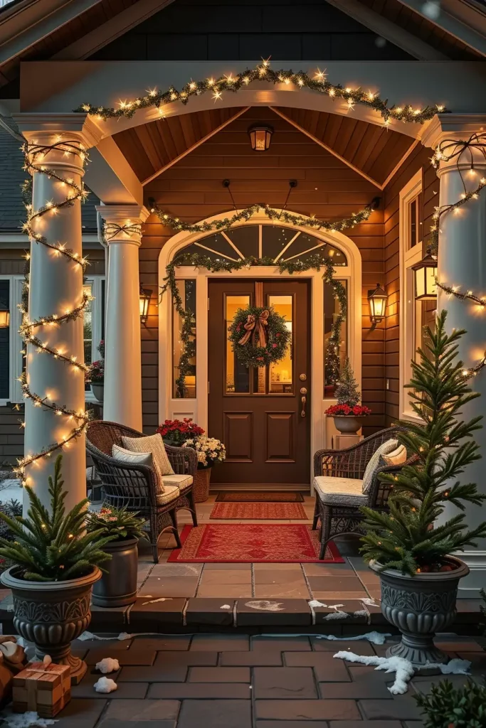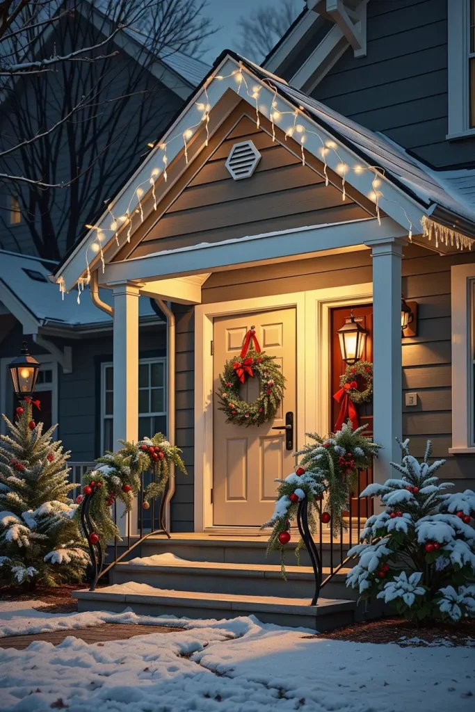 In design, I usually combine icicle lights with a door wreath, and garlands on the railing and some lights on the pathway leading to the house. The warm golden light is suitable with both ancient and contemporary buildings. The arrangement is more welcoming with the addition of natural wood benches or porch swings.