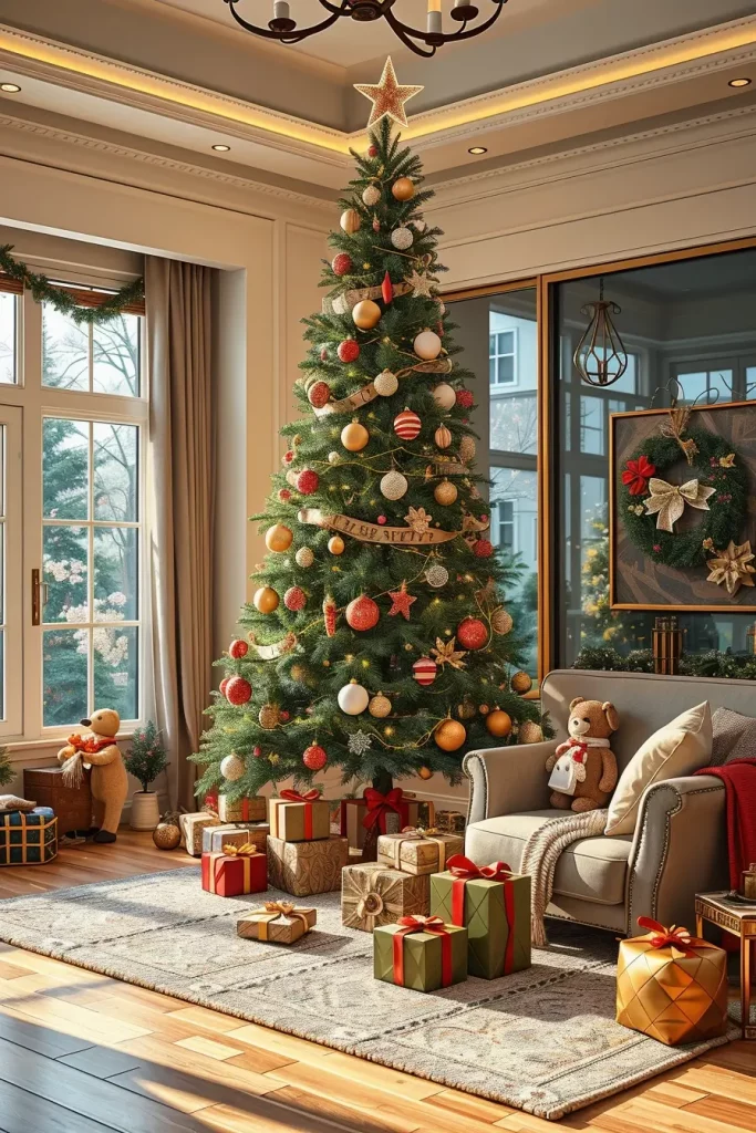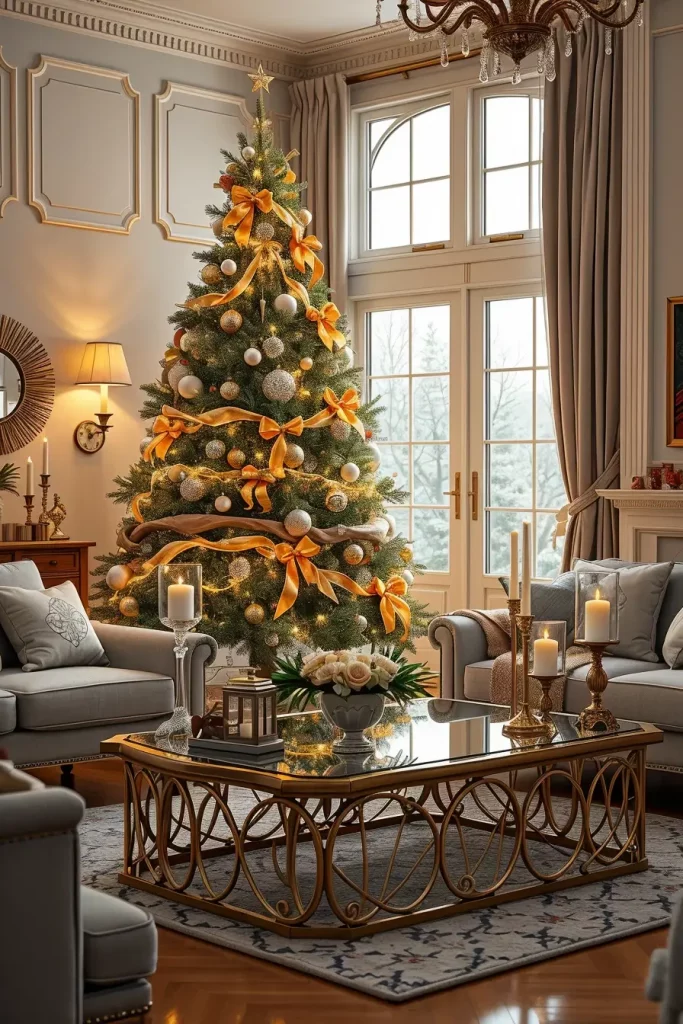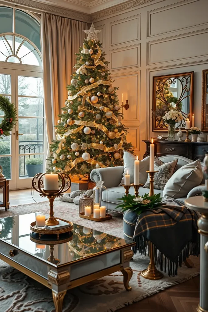 I have the practice of using garlands of lights, intertwined with gold ribbons, or I use the trees, hung with silver decorations that glitter in the warm light. The combination of the two metallics renders a harmonious appearance that can be considered eternal. Metallic furniture-coated furniture, i.e. coffee table, side table, decorative tray, etc. also blends well into this theme.