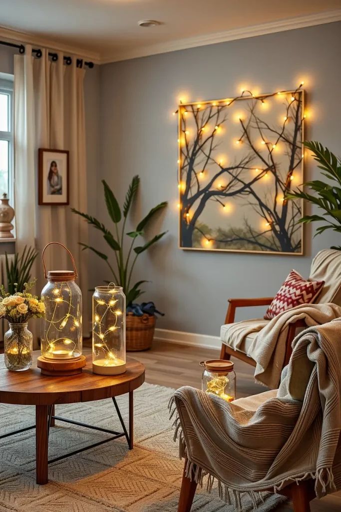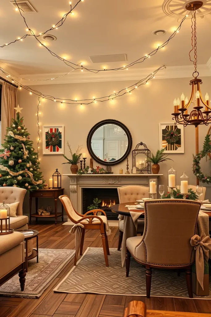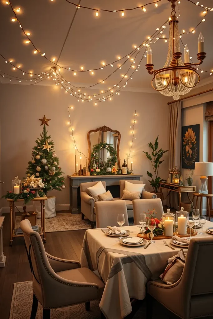 In one of them, I hung fairy lights over a dining table, which was covered with a neutral linen tablecloth, and there were modern upholstered chairs in a beige color. The previous was enhanced by a bar cart in the corner with a garland capped in lights, and small lanterns on the side tables carried the same theme. Every accessory and furniture was well selected to fit the illumination, and the illumination does not seem natural or deliberate.
