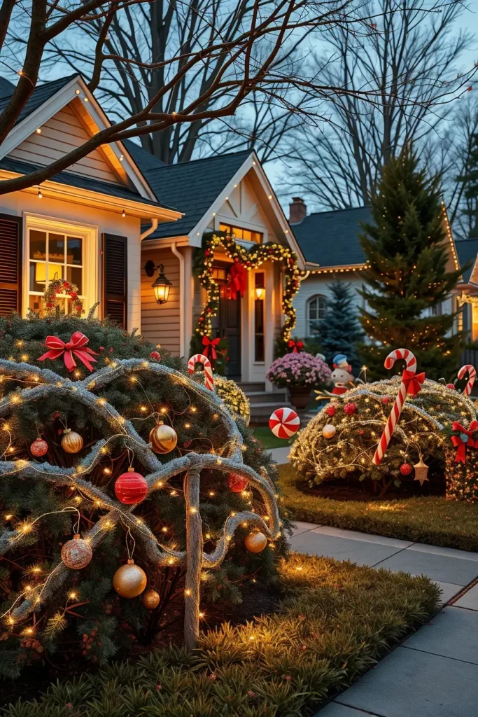 In case I would add something here I would recommend to add net lights and ground stakes that have oversized ornaments or candy cane decor to give depth and make the hedges playful.