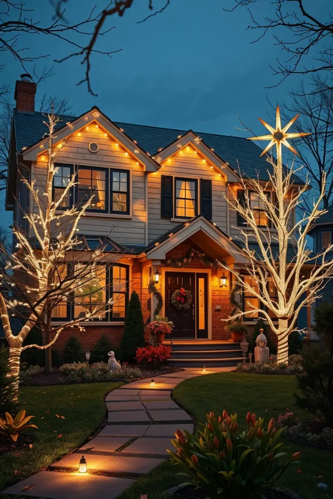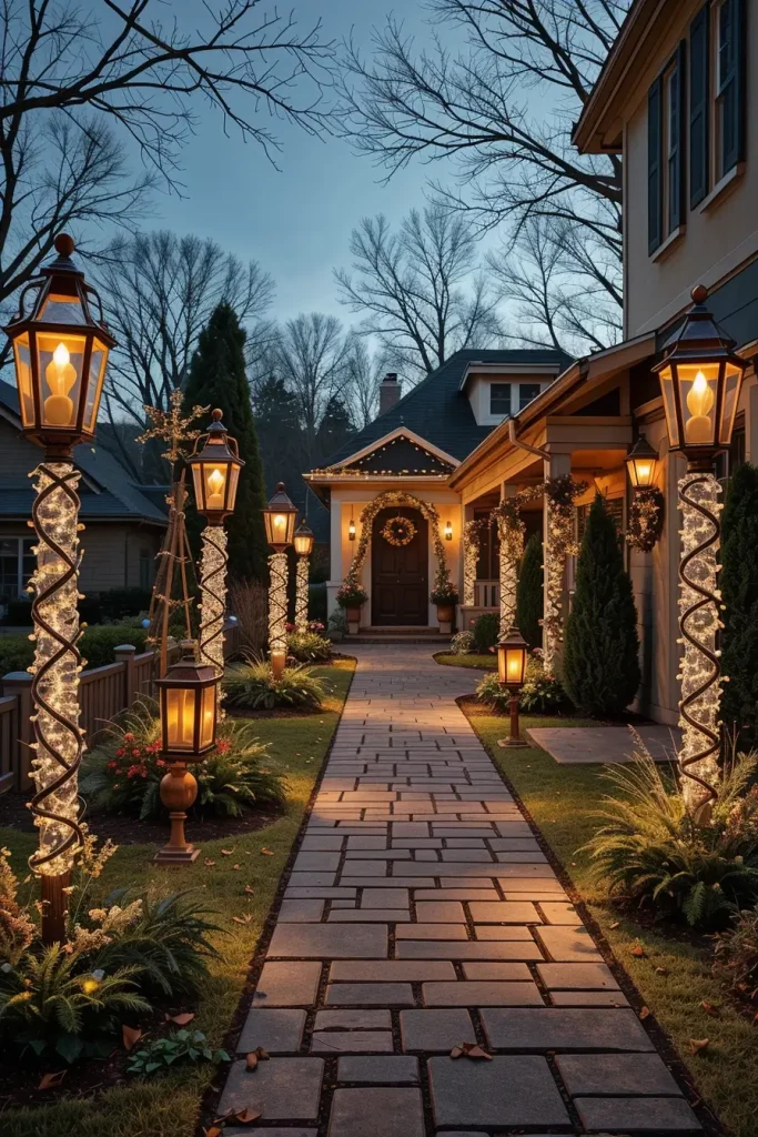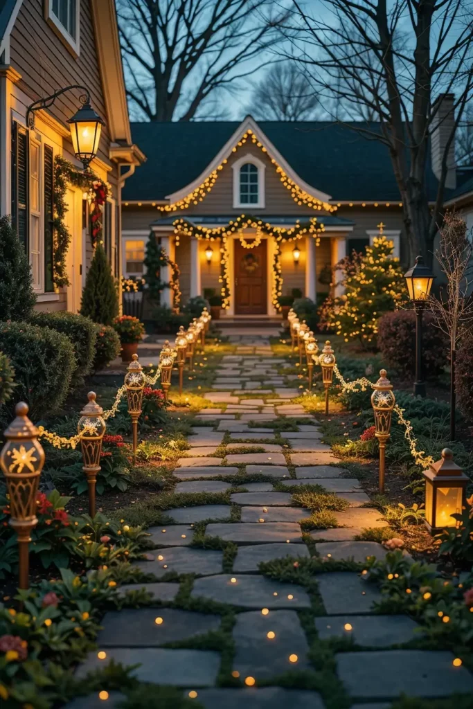I usually suggest the stake lights, lanterns or string lights in a waterproof tubing along the pathways. It is better to be placed at different time intervals to create rhythm and balance, and the combination with the greenery of seasons or little holiday characters adds to the appeal. These lights are especially beneficial when used together with other bigger outdoor lighting systems such as lit trees or front porch garlands.