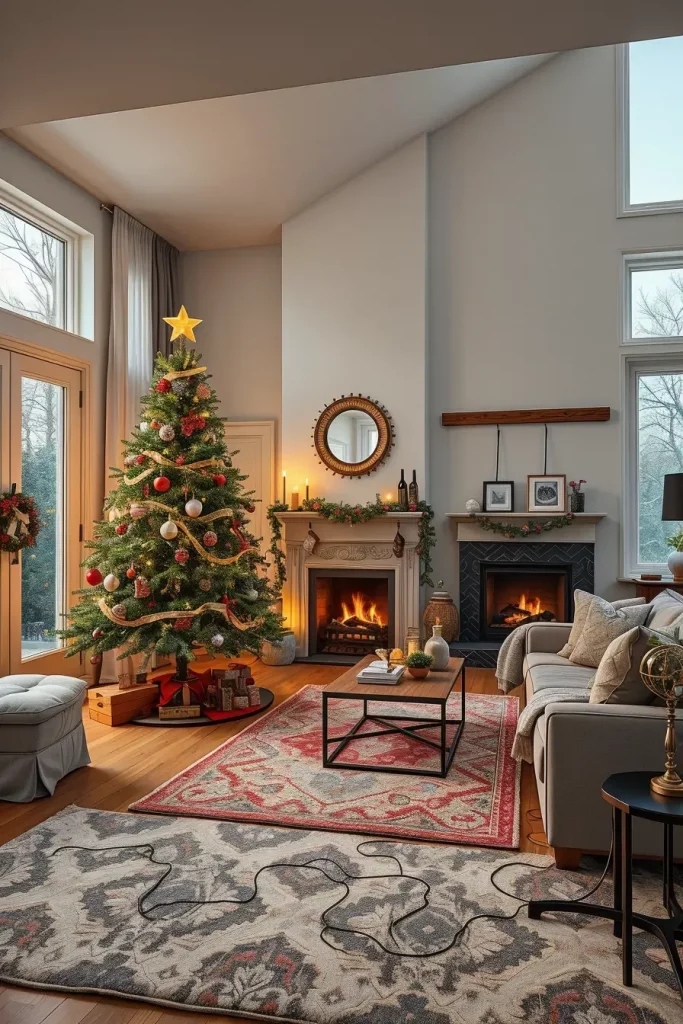 In my planning of a room or an outdoor area, I prefer to incorporate LED warm white lights in as many locations as possible: tree light, mantel decor, roof lighting of an outside, and accents of the porch. The modern furniture, metallic finishes, and decorations that are eco-friendly, such as reusable ornaments and greenery, go well with them.