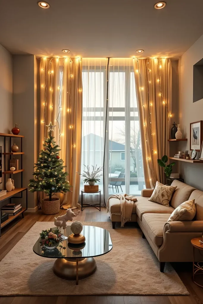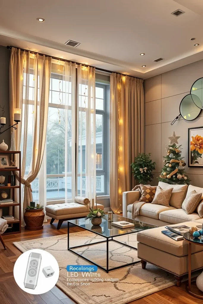 As an illustration, in one of my recent installations, there was a huge living room window to which I placed curtain-like lights, which were coupled with sheer curtains in light cream. The warm light was reflected in a soft beige sectional sofa and a glass coffee table, with wooden accents in the shelving being a natural addition. The fusion provided a contemporary and traditional appearance.