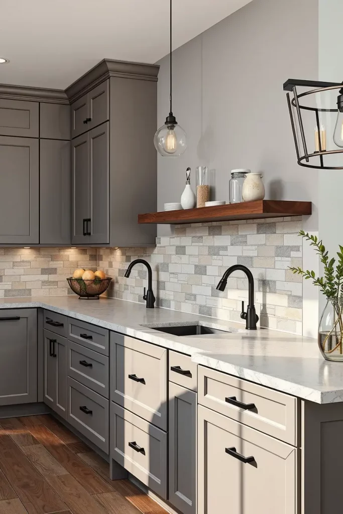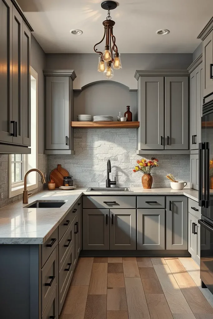 I make this style by putting up reclaimed wood panels that are finished in either nature or a white hue. To get the best look, put matte iron handles, apron-front sinks, and subway tile on the backsplash together. Either distressed hardwood or stone flooring should be used to establish the main feel of the space.