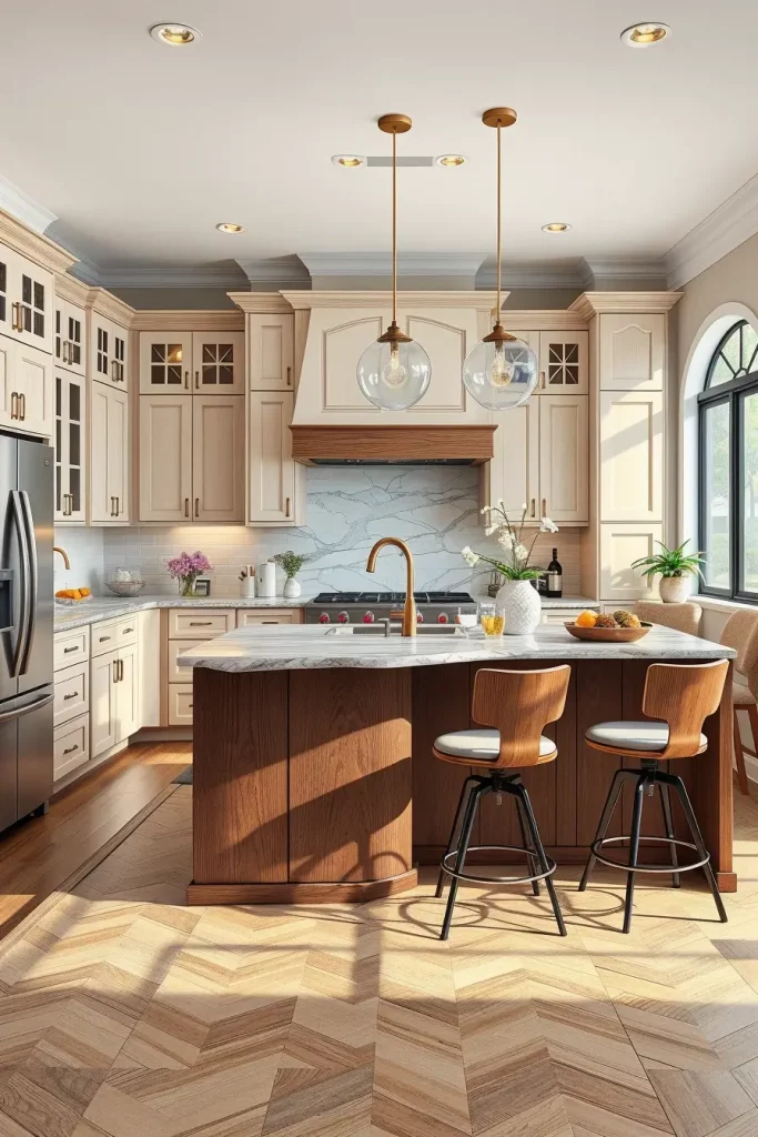 There are shaker-style cabinets with flush doors, all placed around cream-colored stone countertops and brushed brass handles. The pendant lights placed above the island are antique and help the eyes travel up and add symmetry to the space. Dark wood stands out nicely against the soft beige floor and the caramel leather nook.
