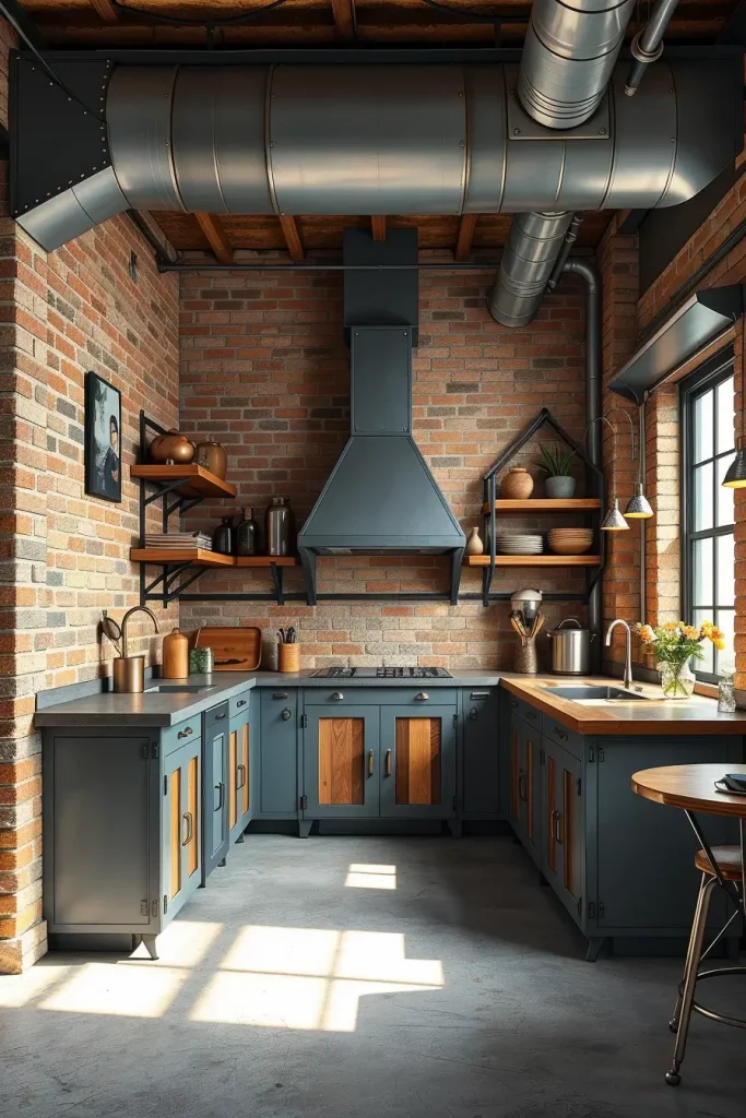 Wood and metal cabinets go well together because they bring warmth and durability to your kitchen. It looks terrific in urban lofts and converted warehouses whose inner walls and pipes are shown.