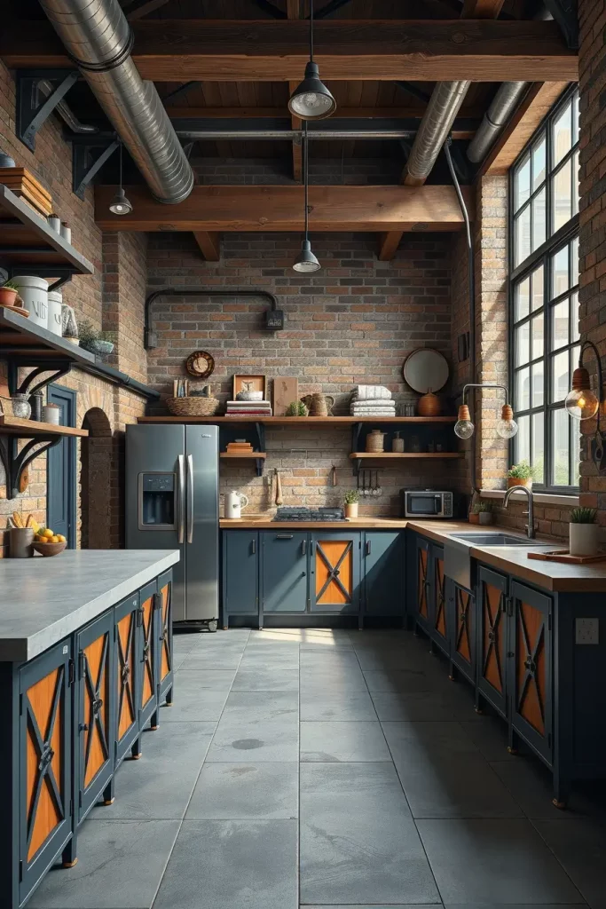 Ordinarily, I go with steel-framed doors that contain panels made out of knotty pine or hickory. The straight lines of the metal go well with the unique curves of the wood. To complete the style, you need black hardware, metal-bracketed open shelving, and countertops made from concrete.