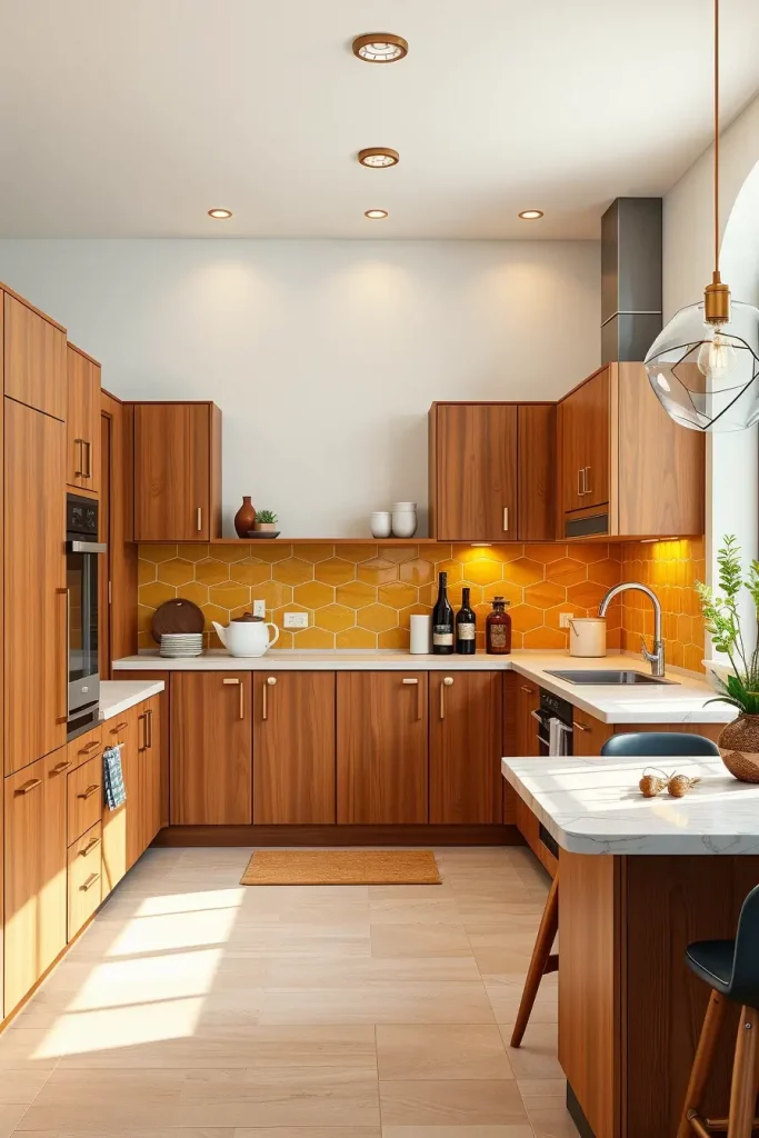 I choose flat-front teak cabinets for this style and, usually, use push-to-open hardware so that the lines look clean. Add ovens right in the kitchen, install quartz counters, and place geometric shape lights to bring in mid-century design. The vertical grains increase the stature and aim of the cabinets.
