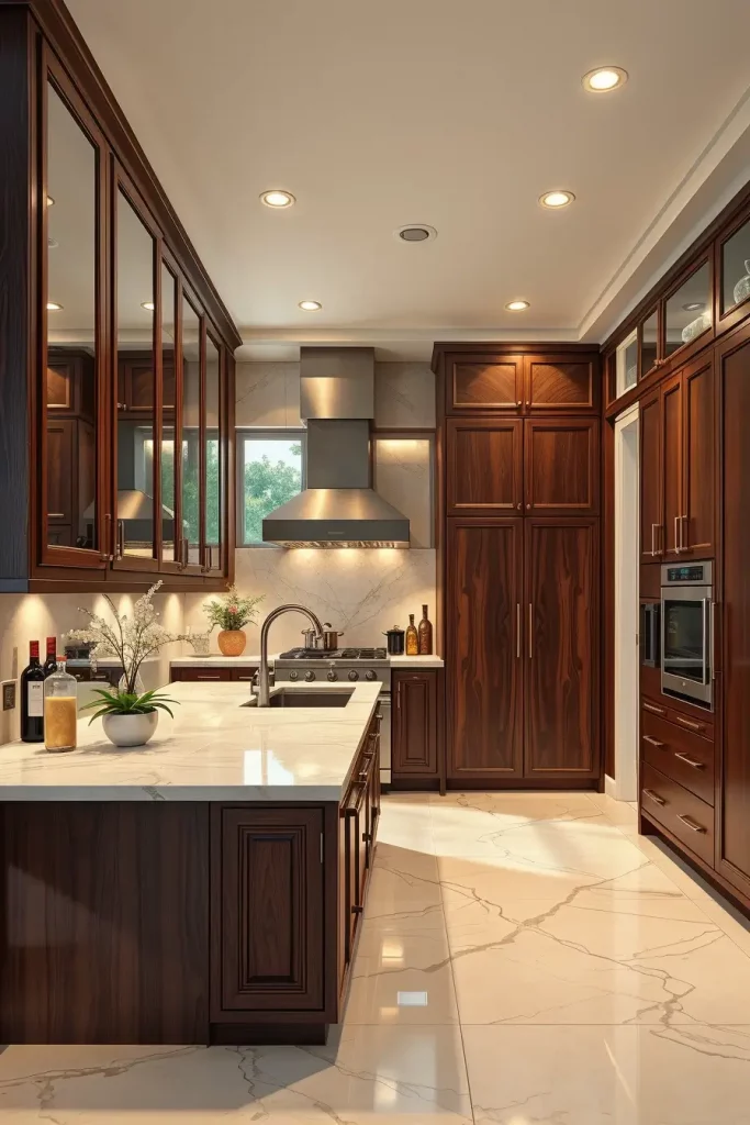 If I use espresso wood for my design, I like to go with mahogany or dark oak, which fits well with waterfall islands, mirrored backsplashes, and lighting housed in the ceiling. High-gloss kitchen spaces feel cozier when the finishes on the countertop are different and lighter.