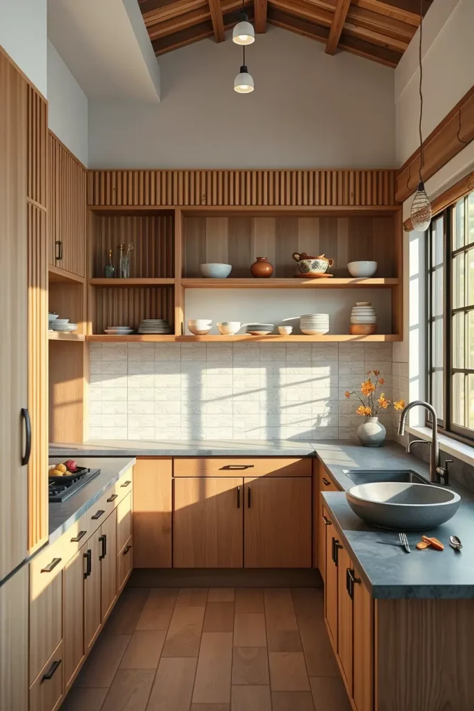 Taking ideas from Japanese Zen, vertical wood slat cabinetry achieves a peaceful, structured, and natural appearance. I have noticed that this taste is suited to modern kitchens with lots of light and a neat design. Vertical lines make a kitchen appear higher and more peaceful.