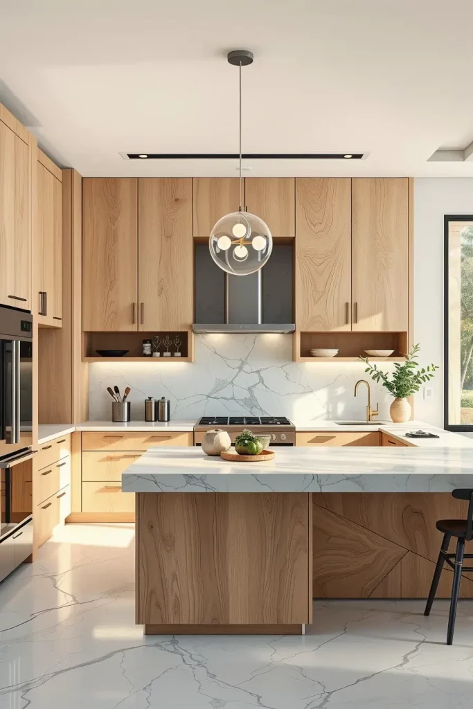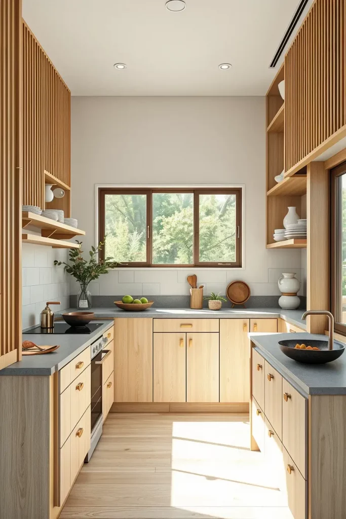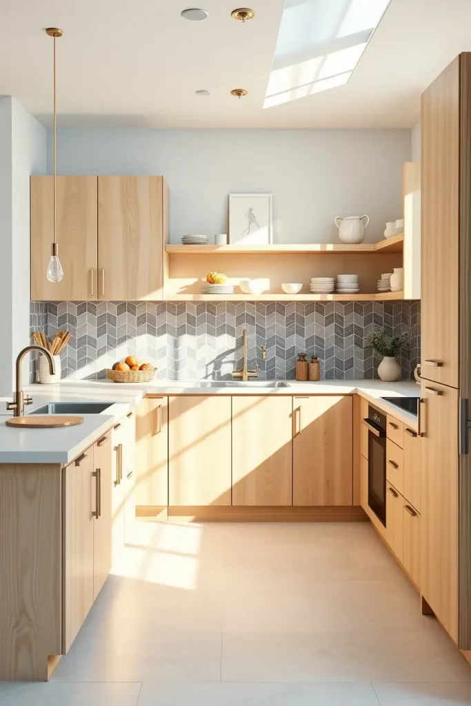 If you’re craving a minimalist kitchen that feels light, airy, and inviting, Scandinavian-style wood cabinetry is an exceptional direction. I selected pale birch and soft maple, finishing them in a matte way so the design would keep its air of simplicity. There is a sense of peace and simplicity about it, so it’s perfect for anyone who wants a clean and tidy living space.