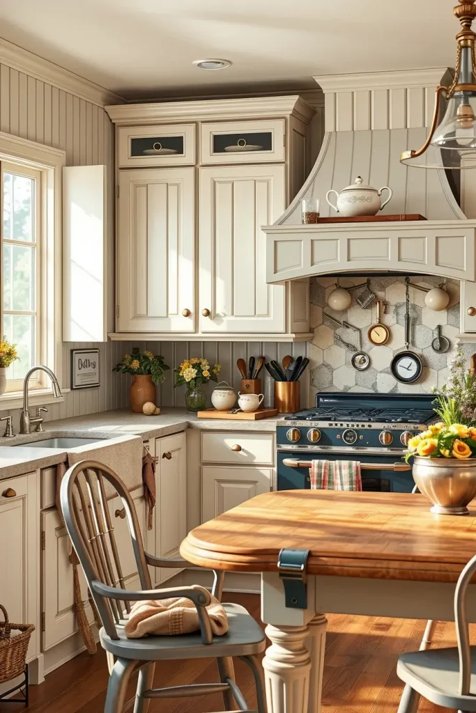 You can also make your dining area better with molding by the top of the cabinets, a center plate rail, and soft lights below your kitchen cabinets. Retro stoves or apron sinks can finish the vintage theme really well.