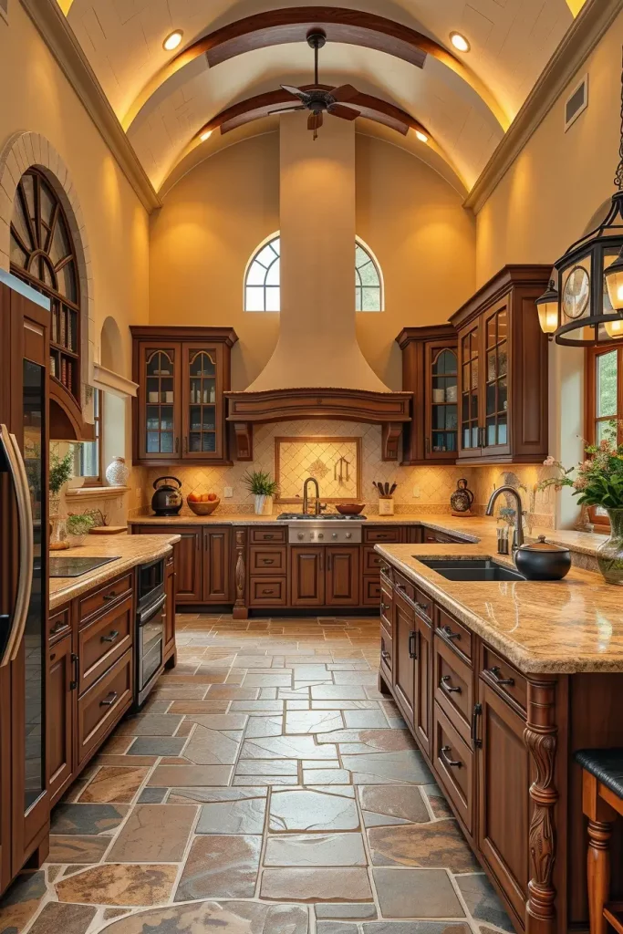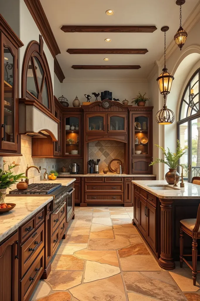 Most cabinets of this style are created from walnut or cherry, having custom-cut arches on their door fronts. Stone floors, tumbled tiles, and arched doorways create the perfect look with them. Fitting some upper cabinet doors with glass helps you maintain plenty of light even within a formal room.