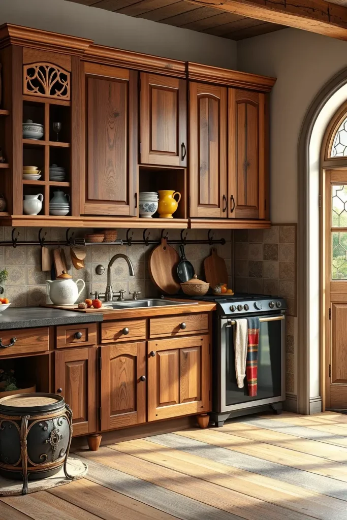This style can be deepened by setting up antique wall racks for spices and inserts made of stained glass in the cabinet doors.
