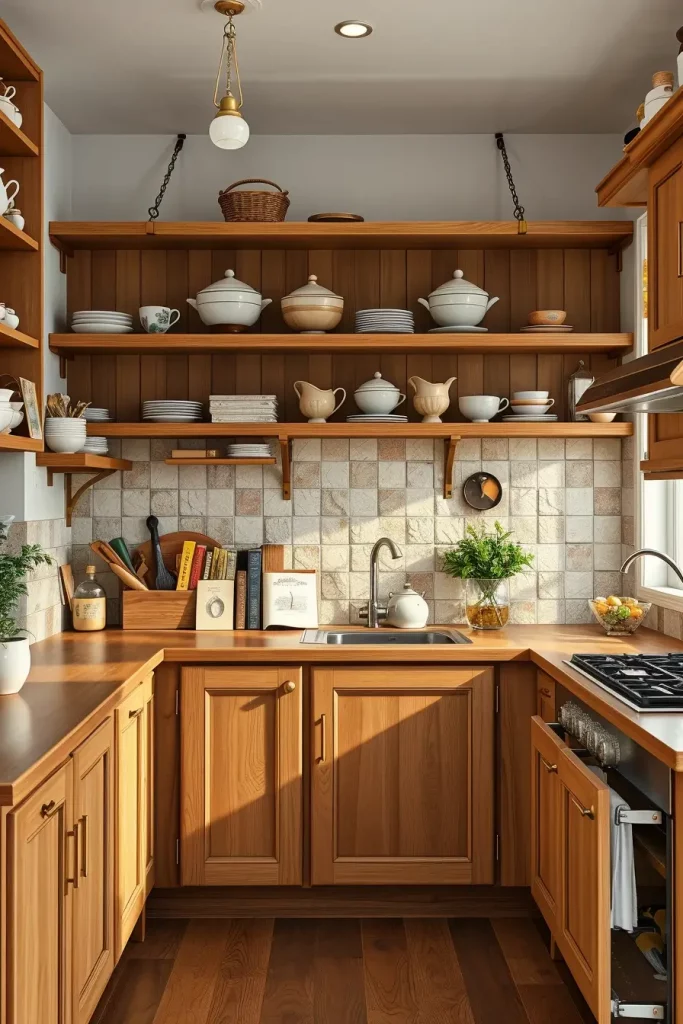 All the cabinetry is made up of traditional shapes, with thick frames and soft closing drawers. The best feature is the copper hardware: every handle and pull has a hammered look that matches the bold look of the wood. I made sure the whole kitchen would look consistent by choosing open timber shelves, an old-style matte copper range hood, and seeded glass fronts on the cabinets.