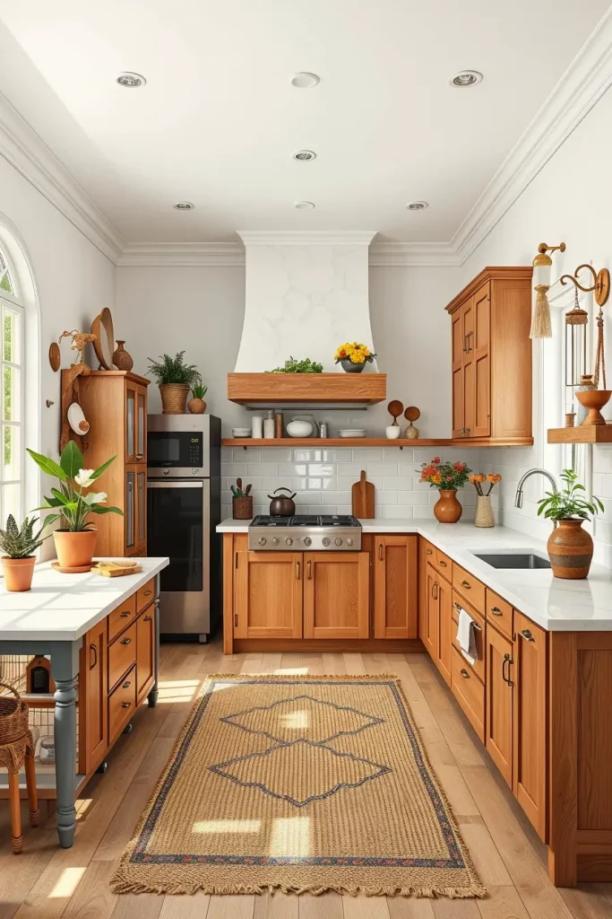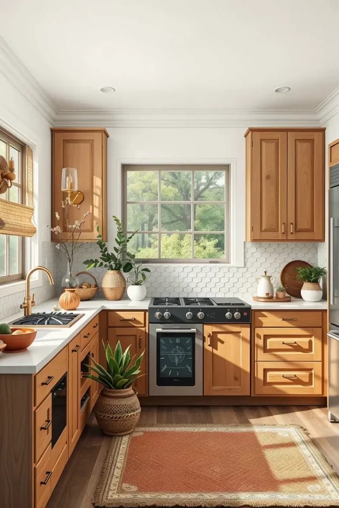 A semi-matte finish has been put on the cabinets to make the yellowness of the wood more noticeable. I connected them using white quartz countertops, a simple subway tile backsplash, and classic brass wall sconces to give the kitchen farmhouse style. The rustic look is made stronger by having natural jute rugs and terracotta planters in the room.