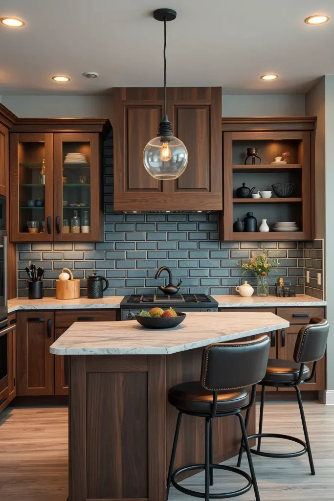 Walnut always stays popular because it’s gorgeous, detailed, and can be used in various ways. With this design, I made a kitchen that is beautiful as well as cozy. The purpose was to make the room look confident and elegant using dark walnut cabinets, without making it too heavy or old-fashioned.