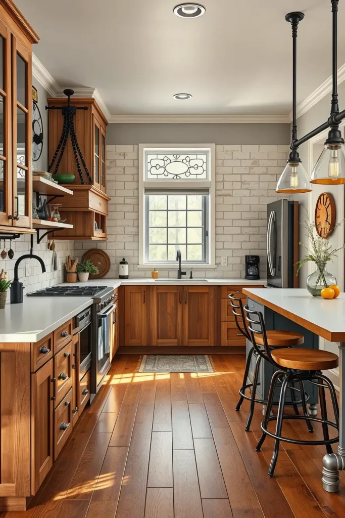 You can make the overall look more appealing by choosing warm lights and iron handles to represent the history. Choose natural stone countertops instead of highly modern ones to match the style of the house.