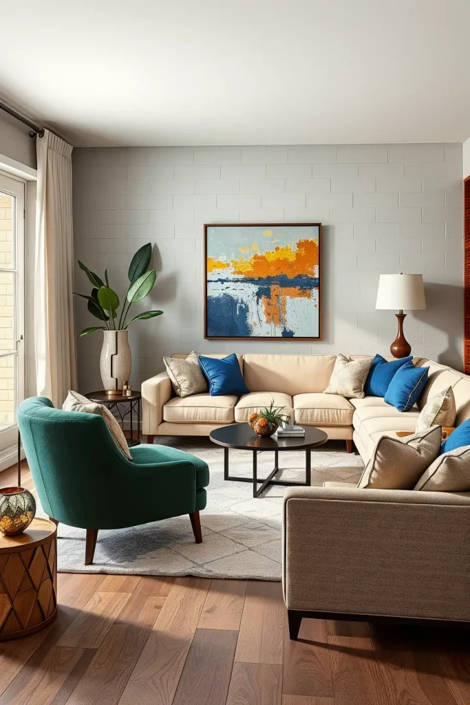 Plain backgrounds bring into focus striking options and do not overload the eye. The dark green armchair or the cobalt blue cushions make a good contrast with the sleek beige sofa to produce a striking and balancing effect. I suggest that one or two shades of accent are chosen carefully to maintain harmony.