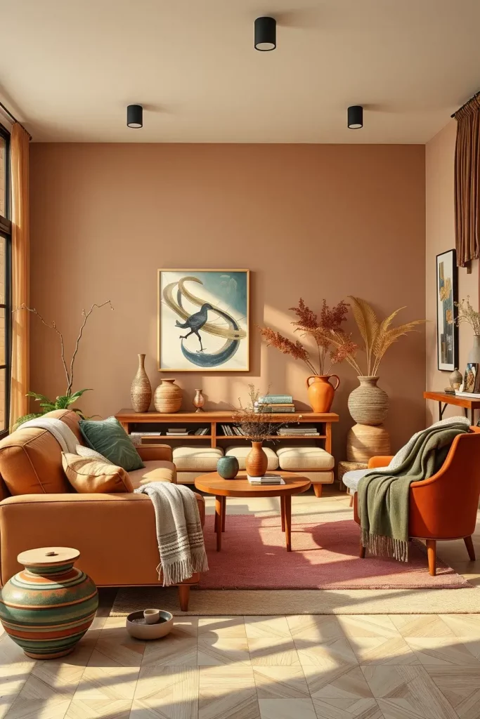 I usually prescribe to clay-colored walls with stone-like flooring or wooden features. Furniture, in the restrained fabrics, like a sand-coloured couch, or rust-coloured armchair, goes well with these tones. The details such as ceramic vases, linen curtains and wool throws help to deepen the feeling of coziness and genuineness.