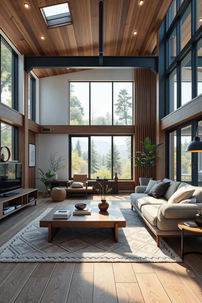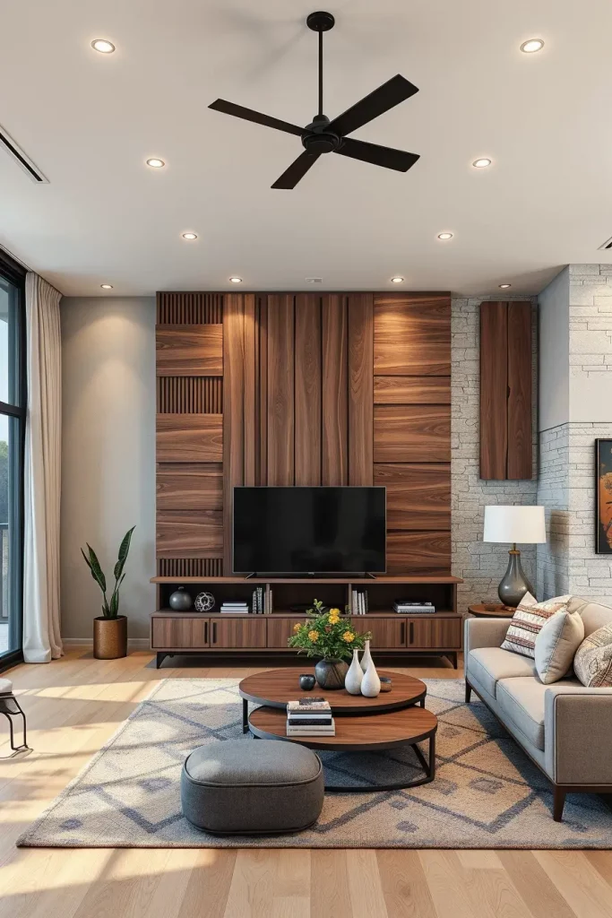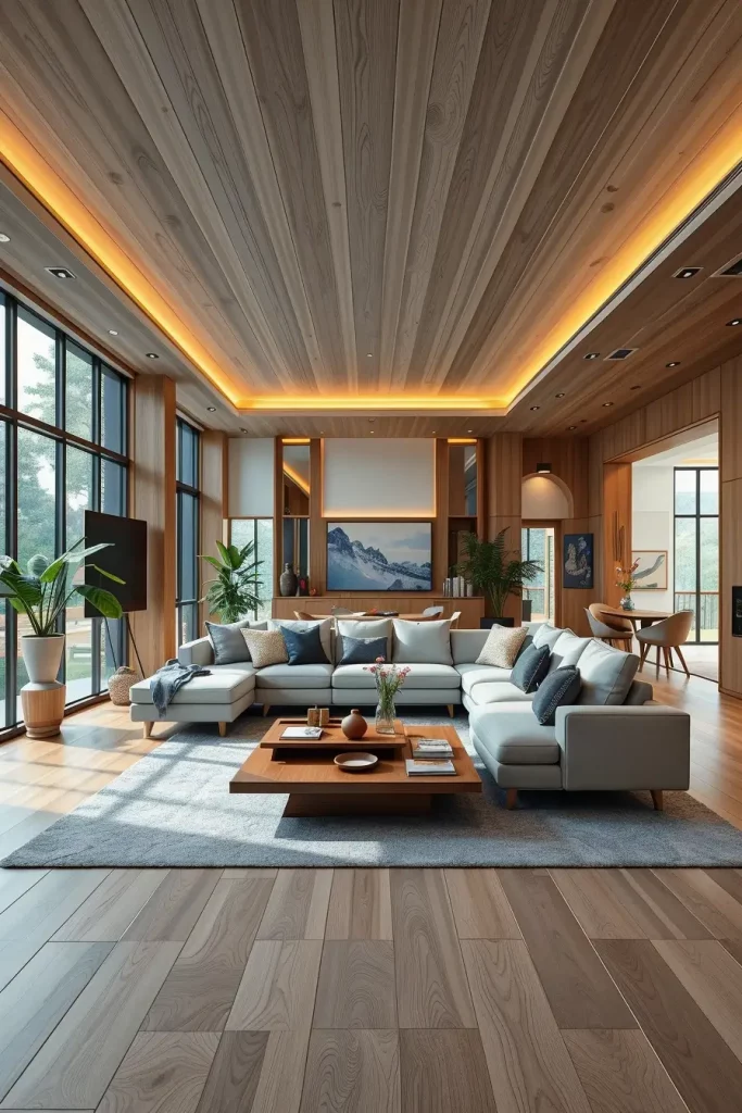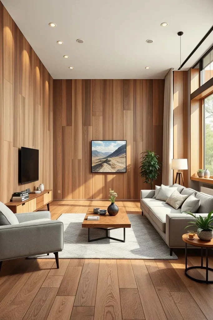Describing a living room in a modern way, I frequently resort to wood to add the homely and natural quality to the interior. Neutral colors and clean lines may imply sterility at times, and the elements of wood paneling on the walls, oak coffee tables, or walnut shelves will make a perfect combination of modern style and comfort. According to the interior designers in 2026, sustainable wood is a major material in the construction of eco-friendly and fashionable home.