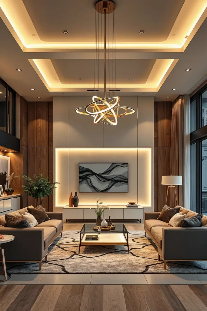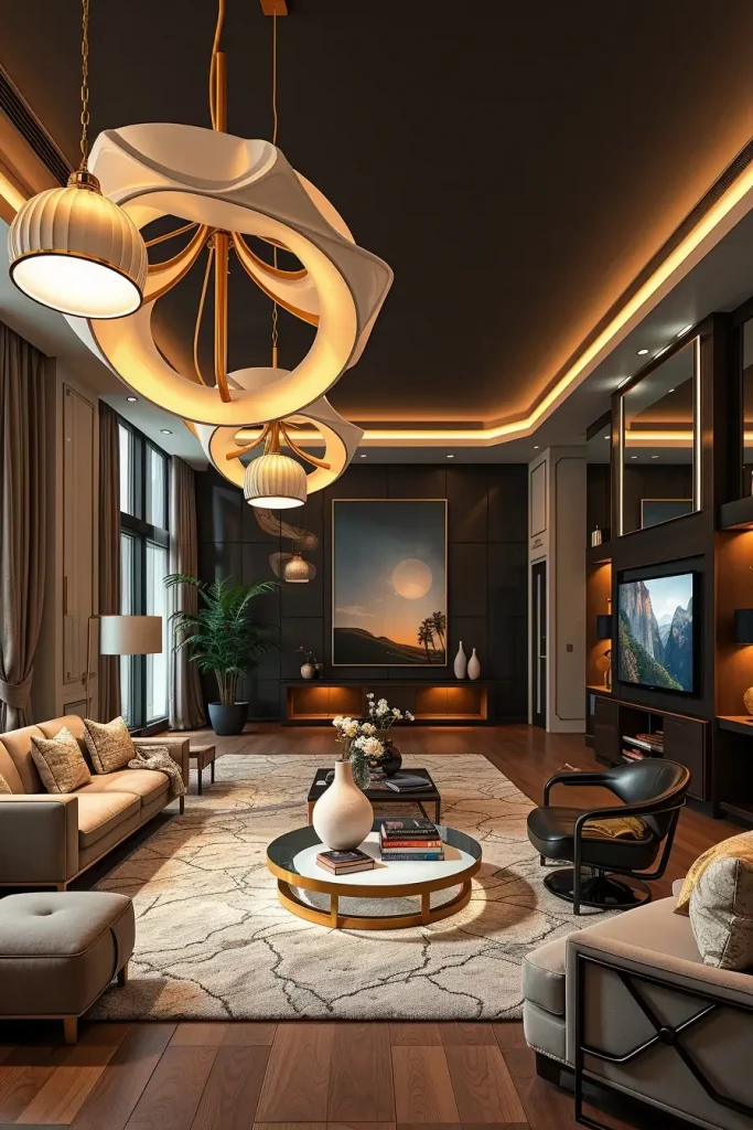 As an illustration, I usually pick massive pendant lights over coffee tables or smooth wall sconce that serves as artwork. These smart LED systems can have variant moods that enable the living room to transform into warm evenings and bright workable rooms.